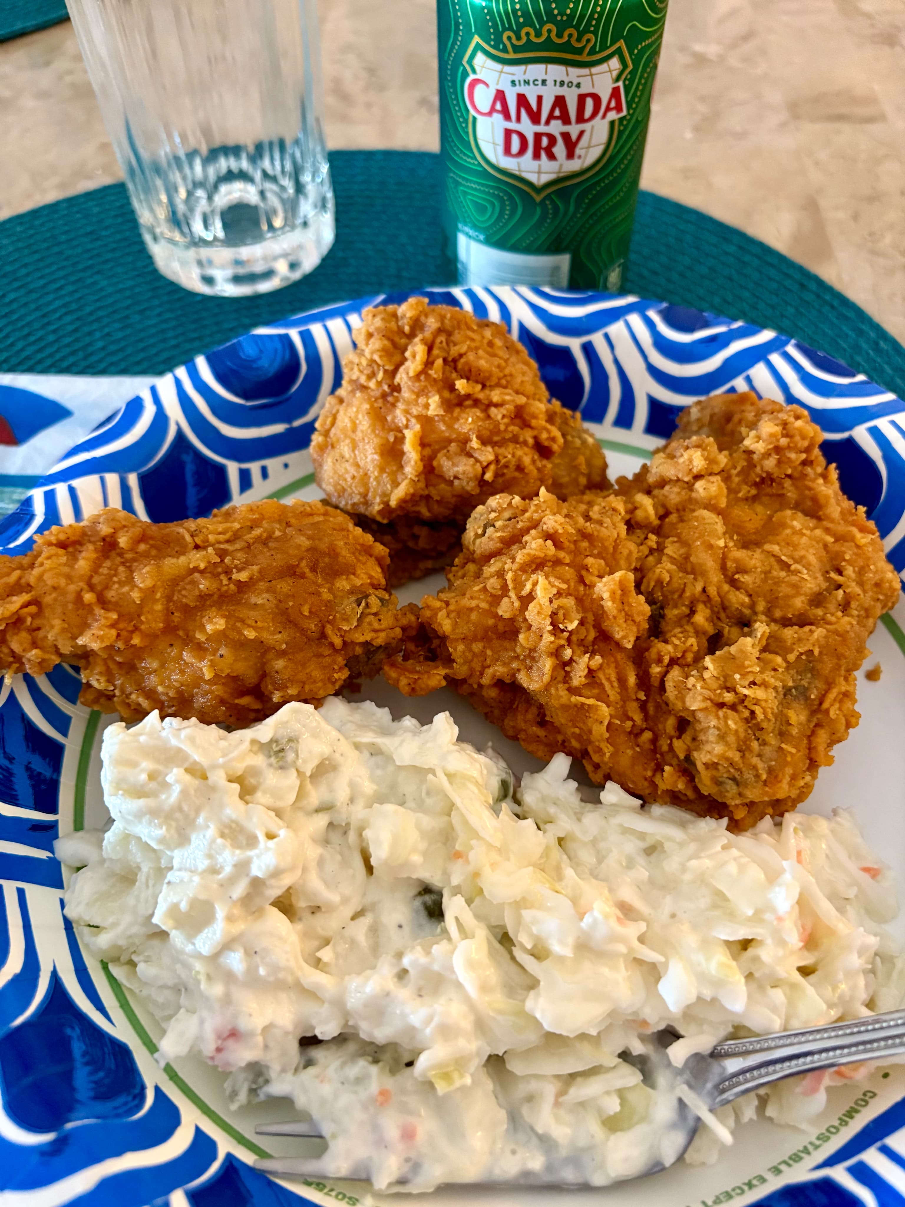 Our last dinner(and lunch )in Naples FL was Publix fried chicken and some sides, coleslaw and potato salad. Real good chicken, but the smallest size was an 8 piece pack and the two of us just couldn’t eat it all, my sister will try to pawn it off on one of her lovely neighbours