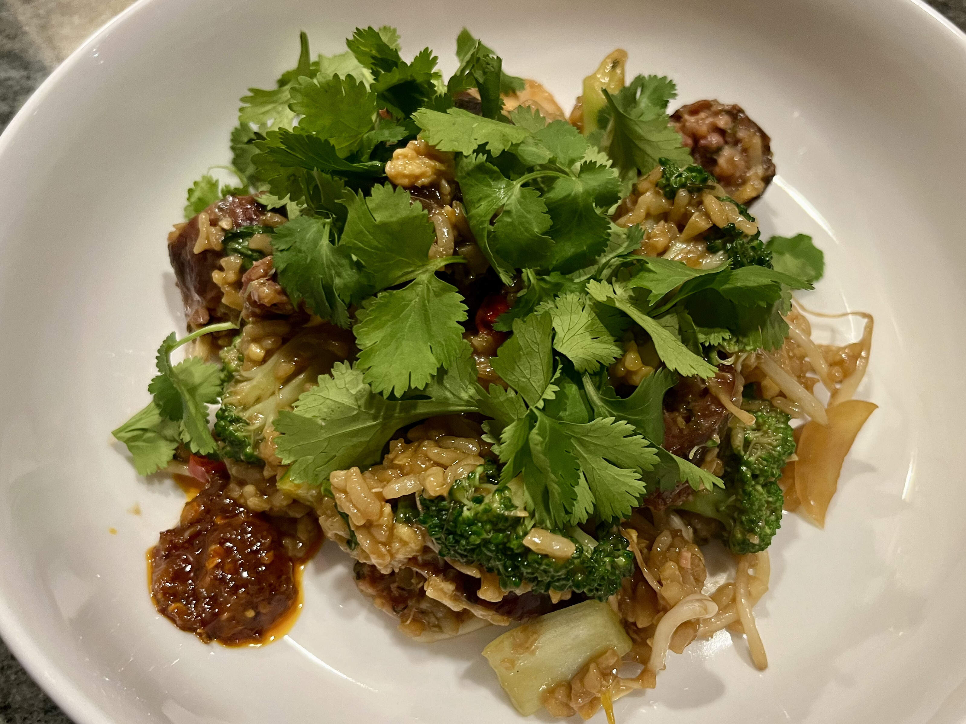So — obviously the texture wasn’t ideal, and I sorta combined two WoL recipes (the veg fried rice plus the brown sauce for shrimp and broc), but it was easy & tasty.