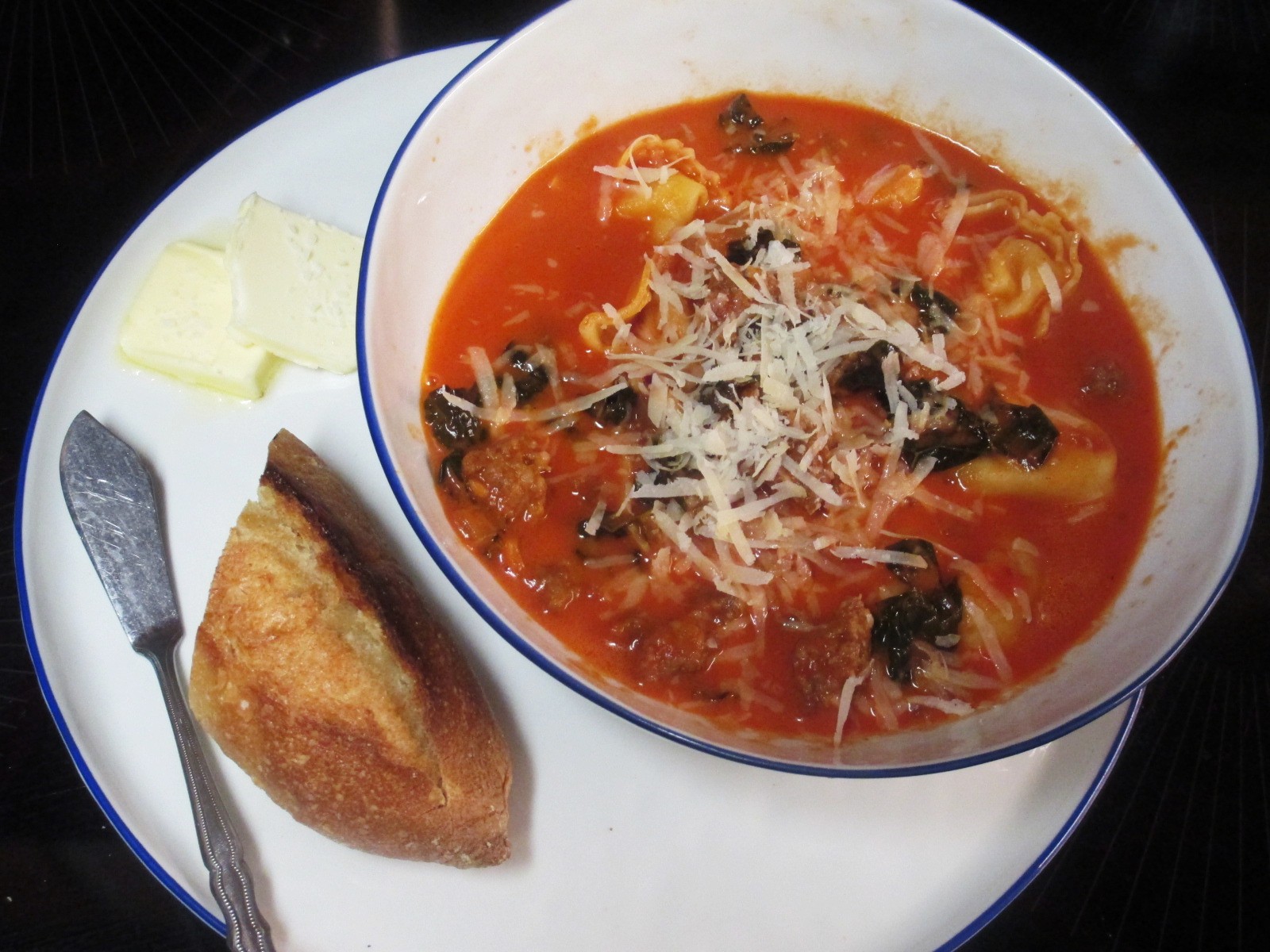 NYT Creamy Tortellini Soup from the freezer, warm baguette, butter. There was a dirty Gibson rocks.