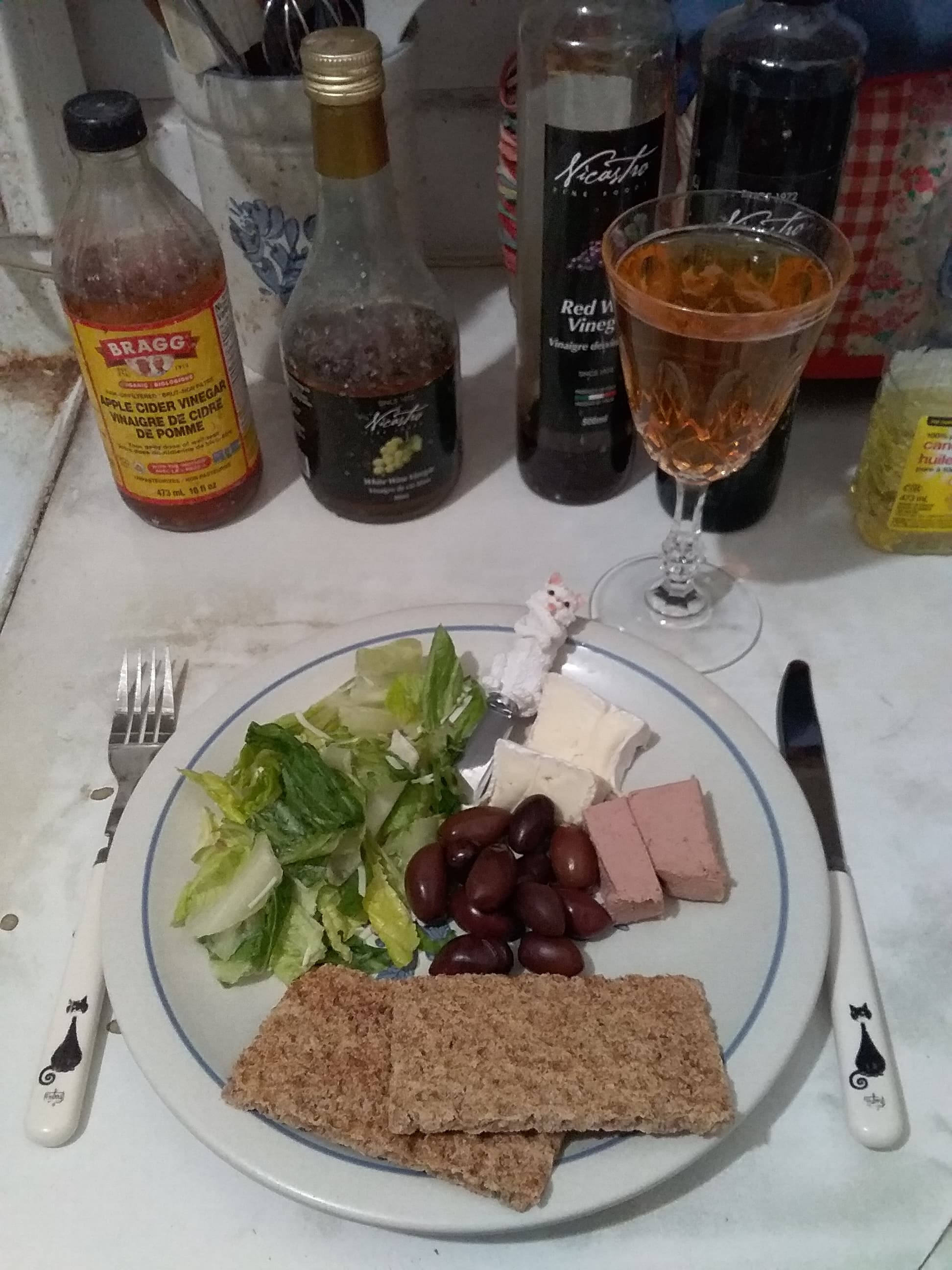 Time for kickoff. I had a little Lady Laurier Athabaska cheese, Première Moisson pate de foie, a small caesar salad,kalamata olives and a couple of Ryvita.