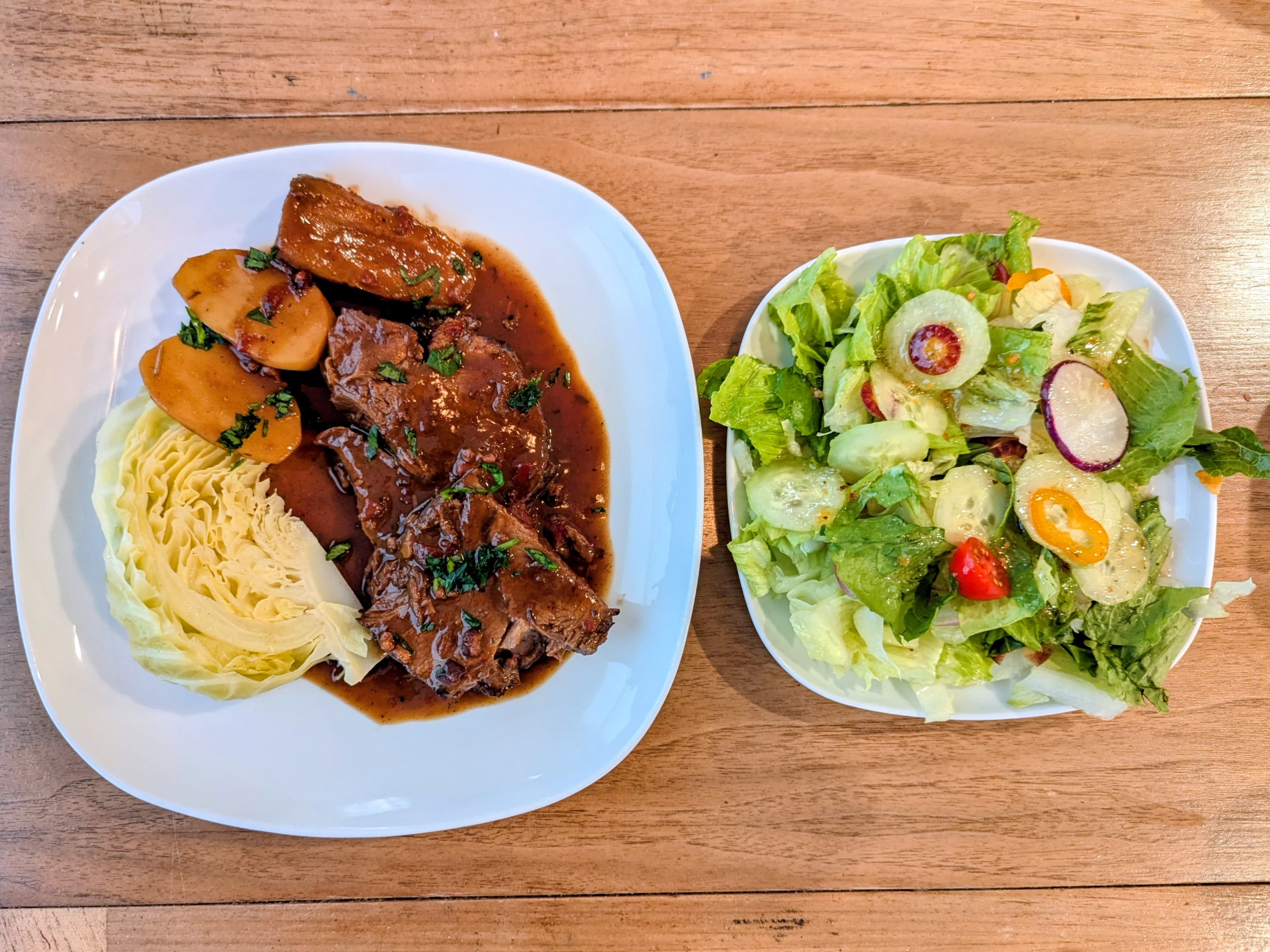 Tonight I made ATK’s Barolo [Zinfandel]-braised beef roast served with braised carrots and potatoes and steamed cabbage and green salad on the side. We are really liked this.