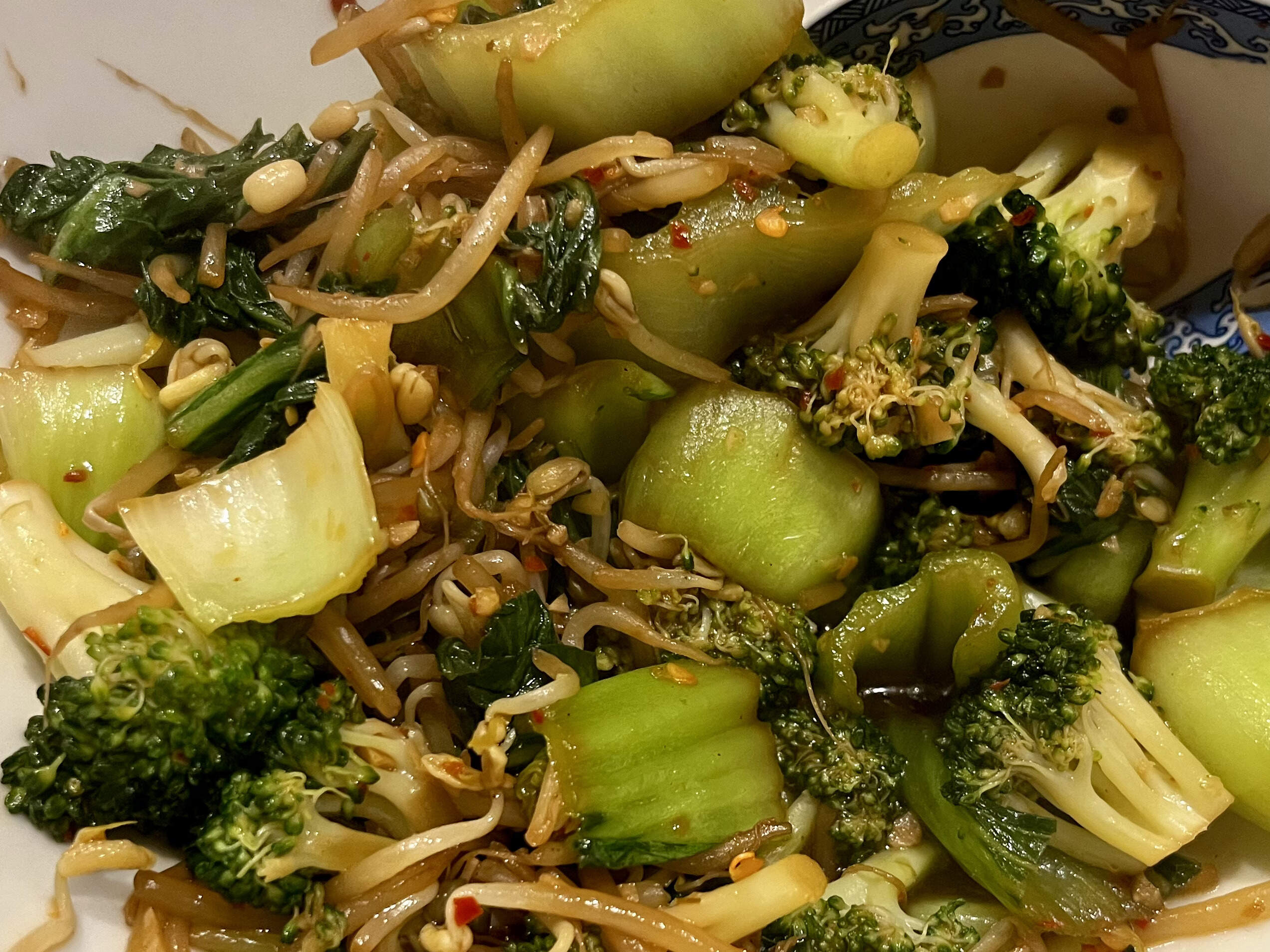 I stir-fried the leftover mung bean sprouts, baby bok choy and broc florets in the wok before adding it to the nuked rice.