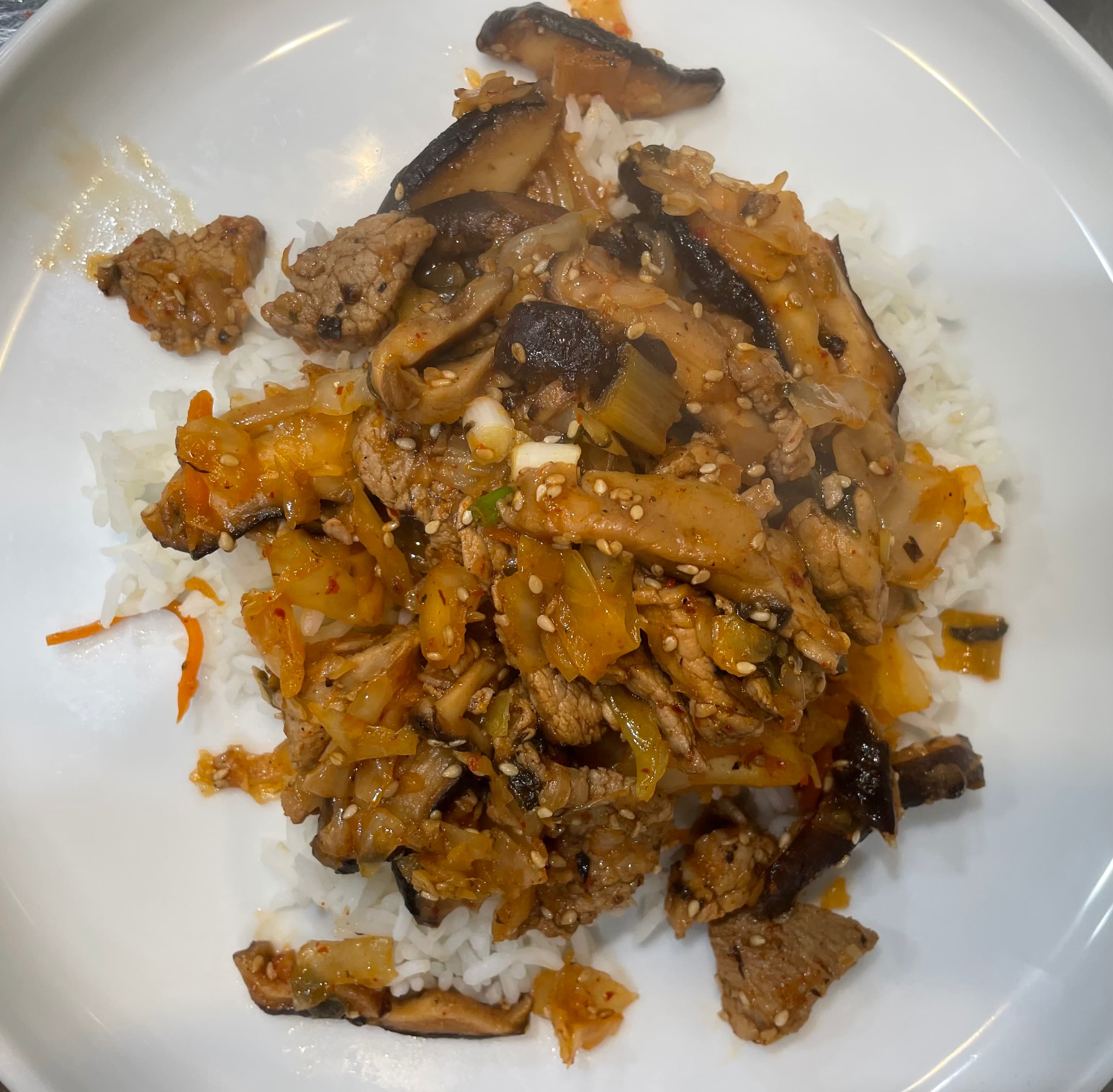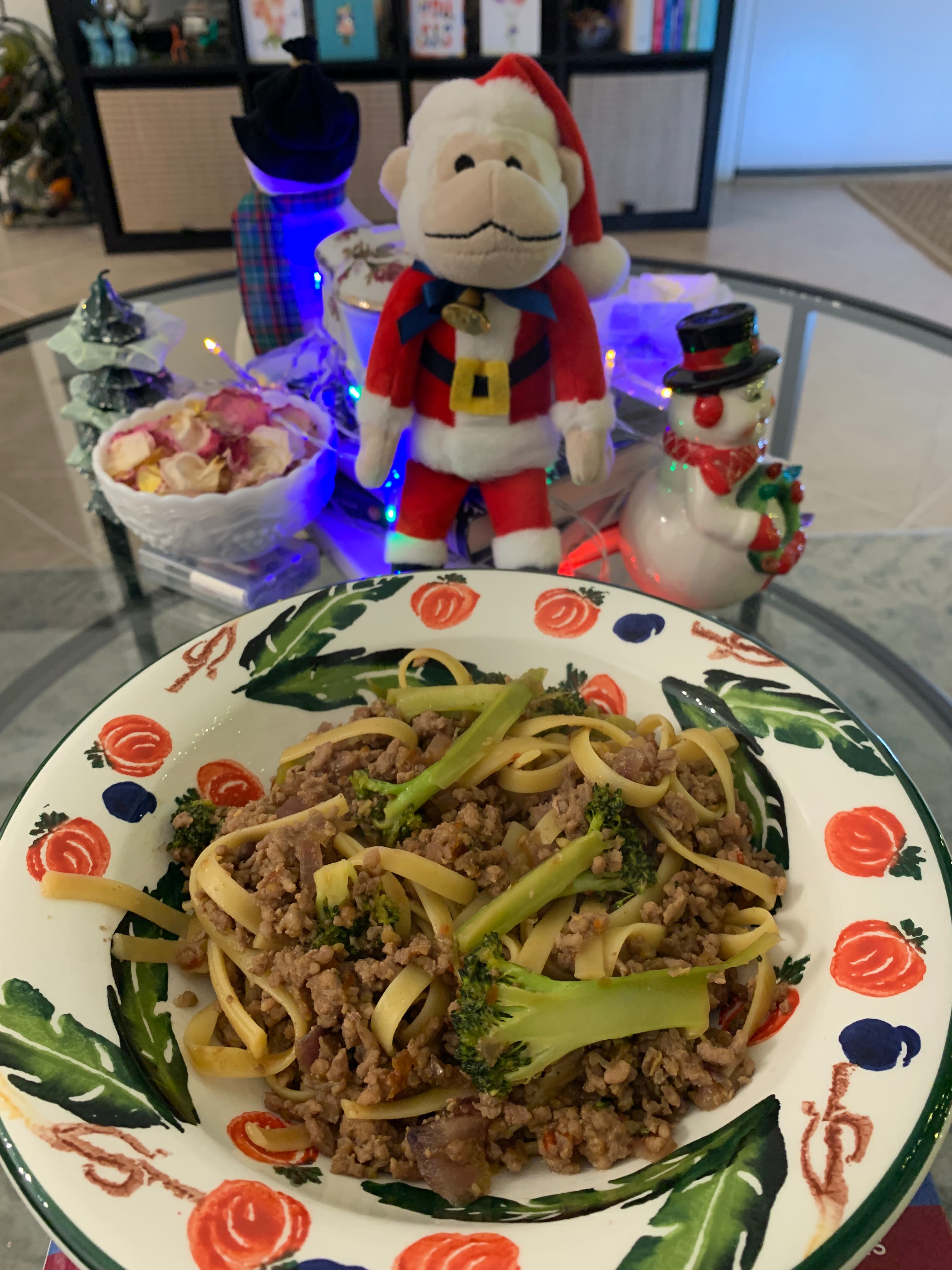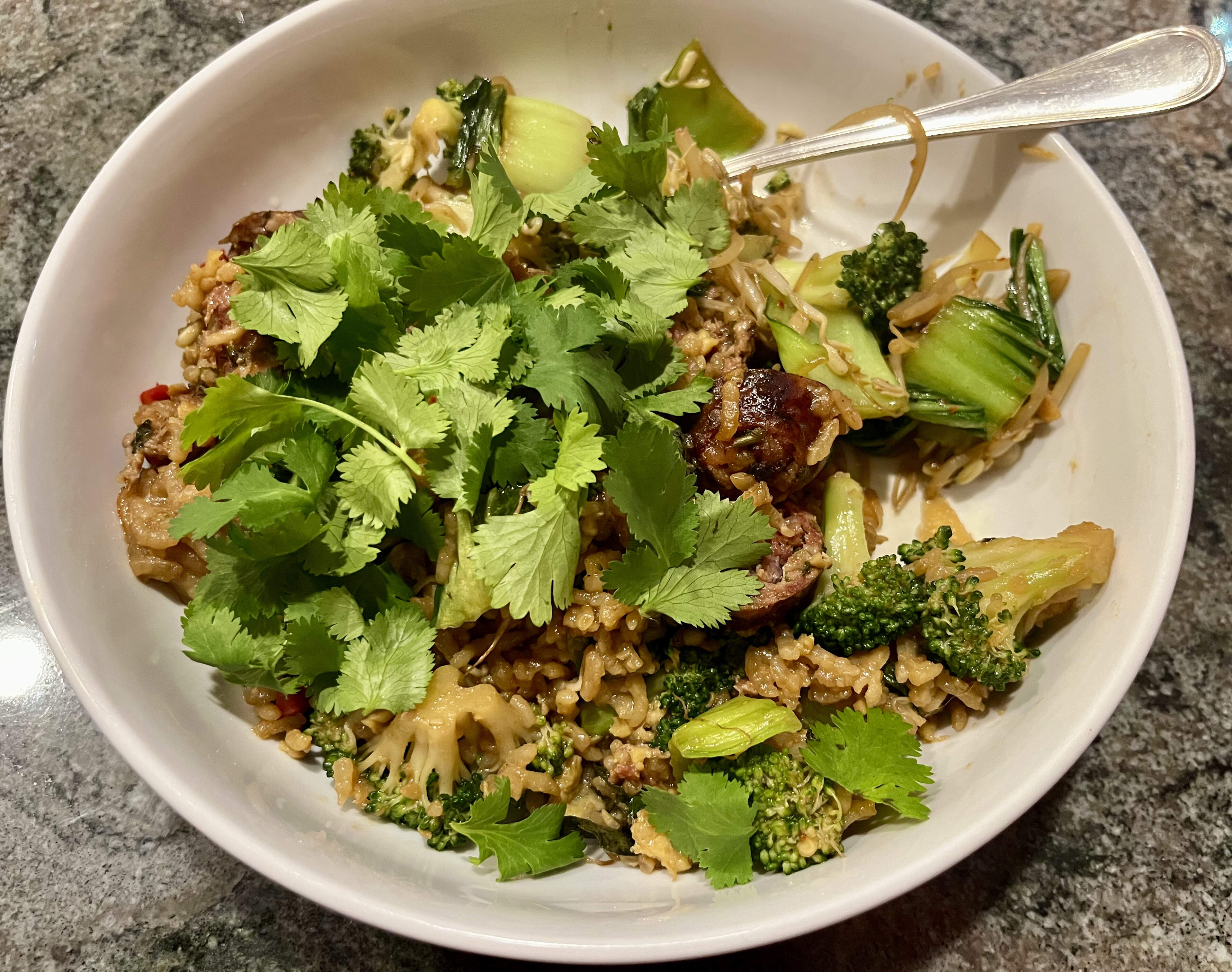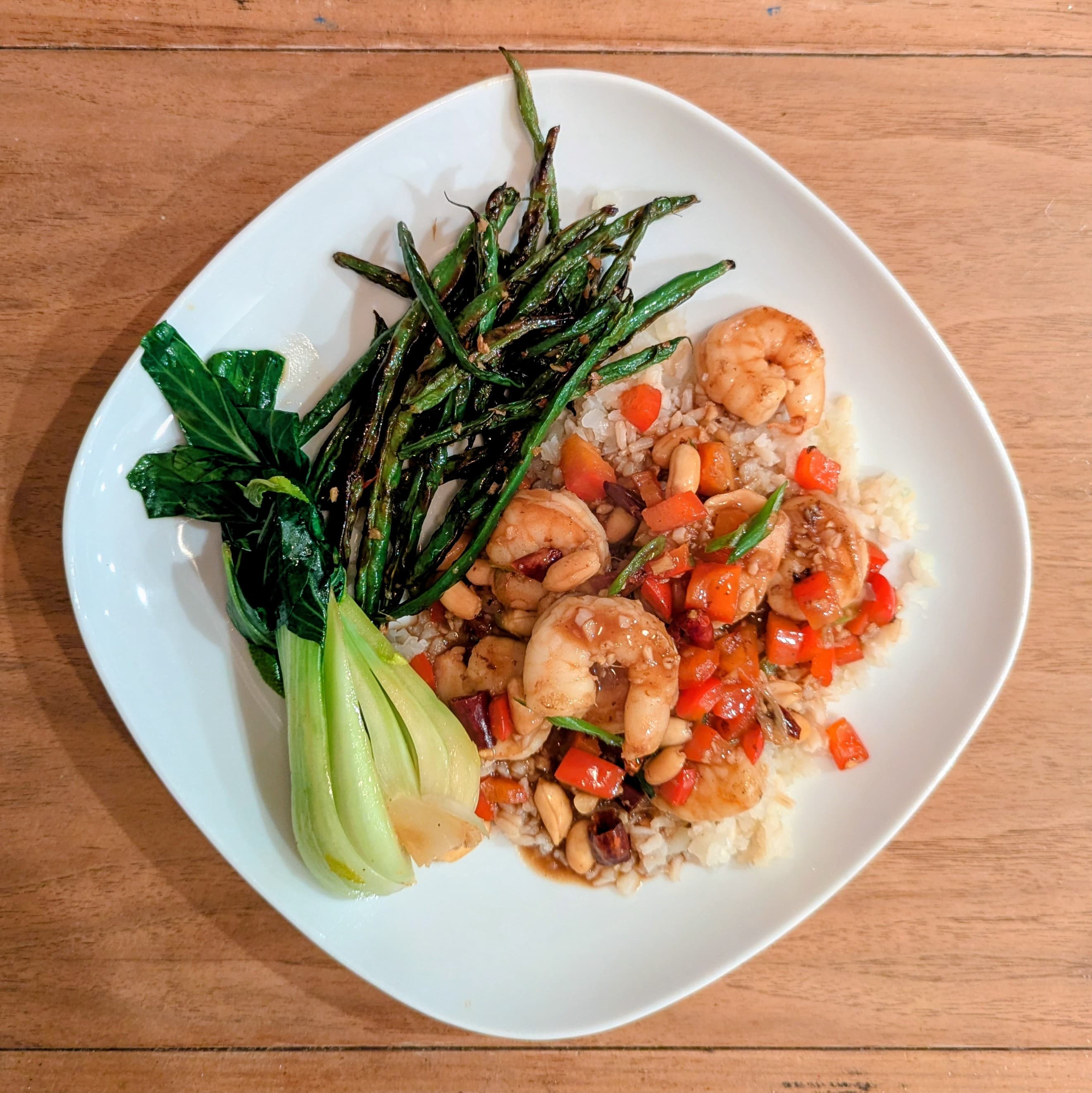 Last night I made ATK’s kung pao shrimp served over brown cauliflower rice blend with dry-fried green beans and steamed baby bok choy. My one change was to substitute Chinese sweet soybean paste for the hoisin called for in the recipe; I don’t like the 5-spice flavor in the dish at all.