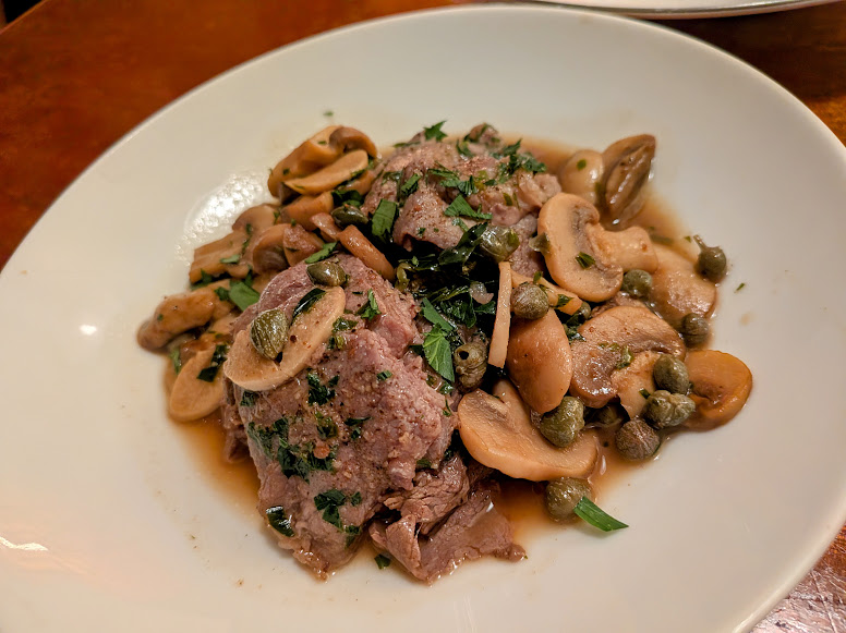 Wed., i was craving an orzo dish so I sent him a recipe with feta and parm and tomatoes. So good. Also, he took some of the leftover ribeye and made a piccata of sorts with it. The mushrooms with the briny capers were the best part, as the thinly cut steak didn’t soak up most of the buttery/lemony sauce.