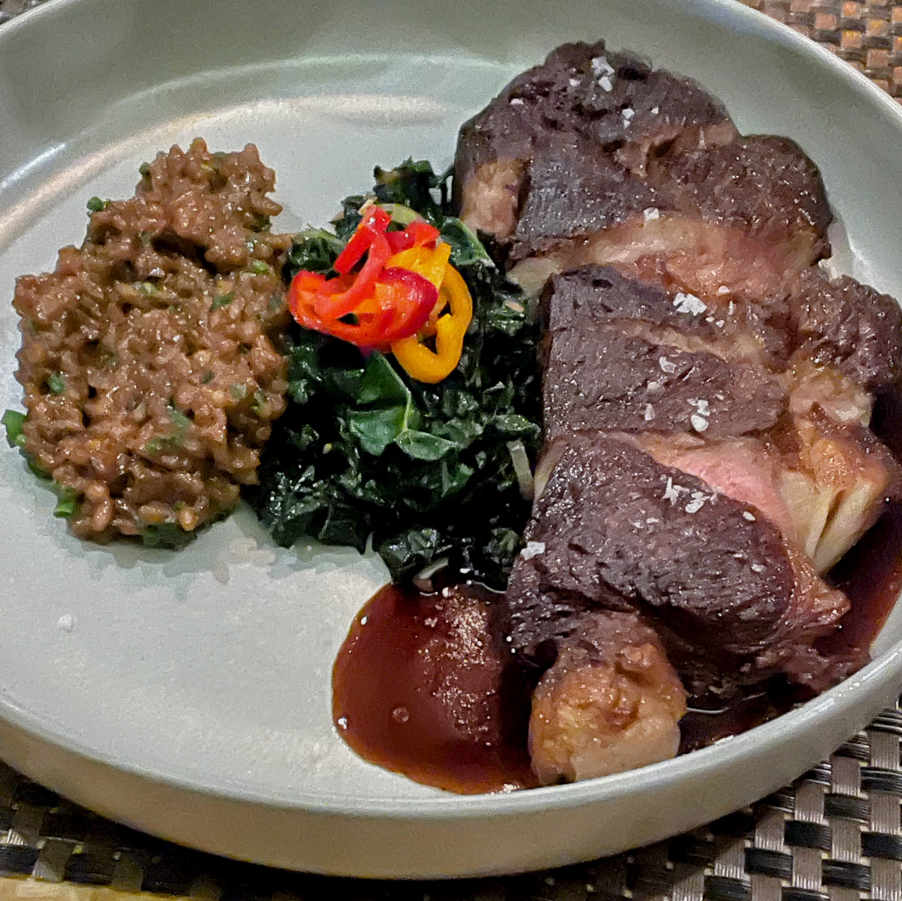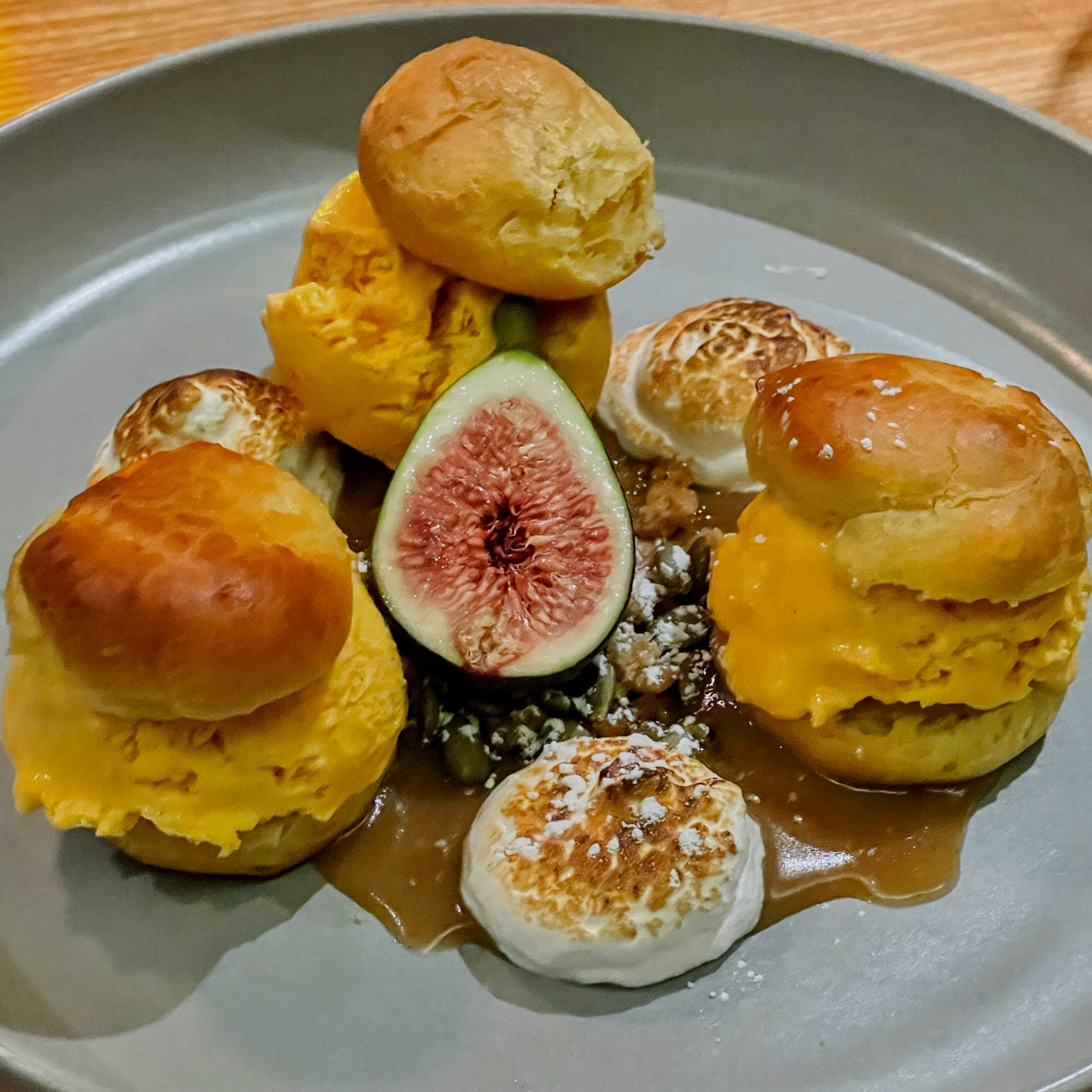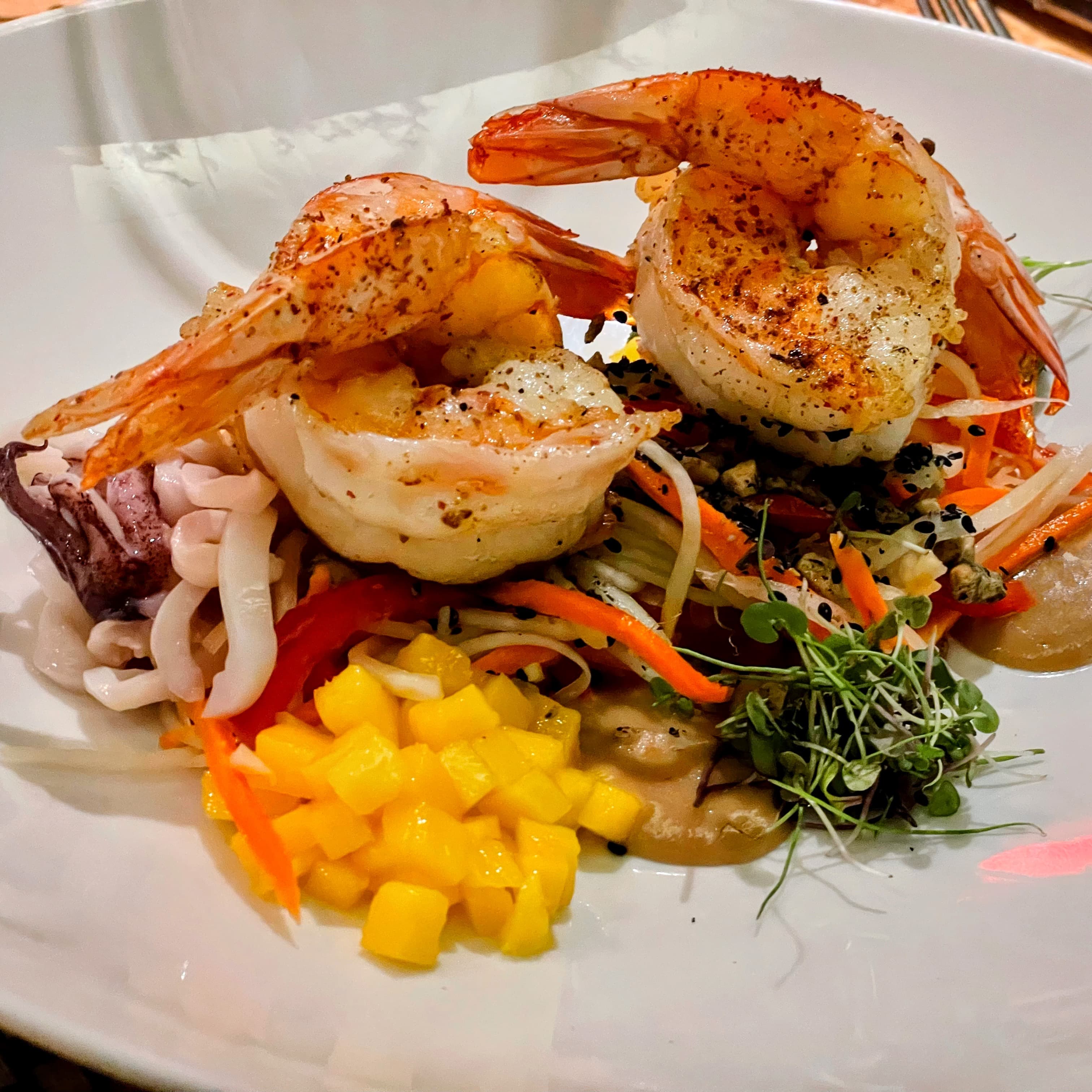 We enjoyed another outstanding dinner at James on Main, in Hackettstown, NJ, including wild gulf shrimp with thai chili marinated squid, green papaya, mango, peanut scallion vinaigrette; ribeye with porcini mushroom risotto; yellow coconut curry with coral tooth mushroom and toasted pumpkin seeds, roasted Japanese eggplant, sticky black rice; duck confit spring roll with pickled hon shimeji mushroom & seaweed salad, smoked lions’s mane mushroom teriyaki hot sauce; baby lacinato kale salad with roasted red beets, crispy chickpeas, caesar dressing; crispy hand cut fries. For dessert we enjoyed profiteroles with pumpkin semifreddo, brown butter toffee,