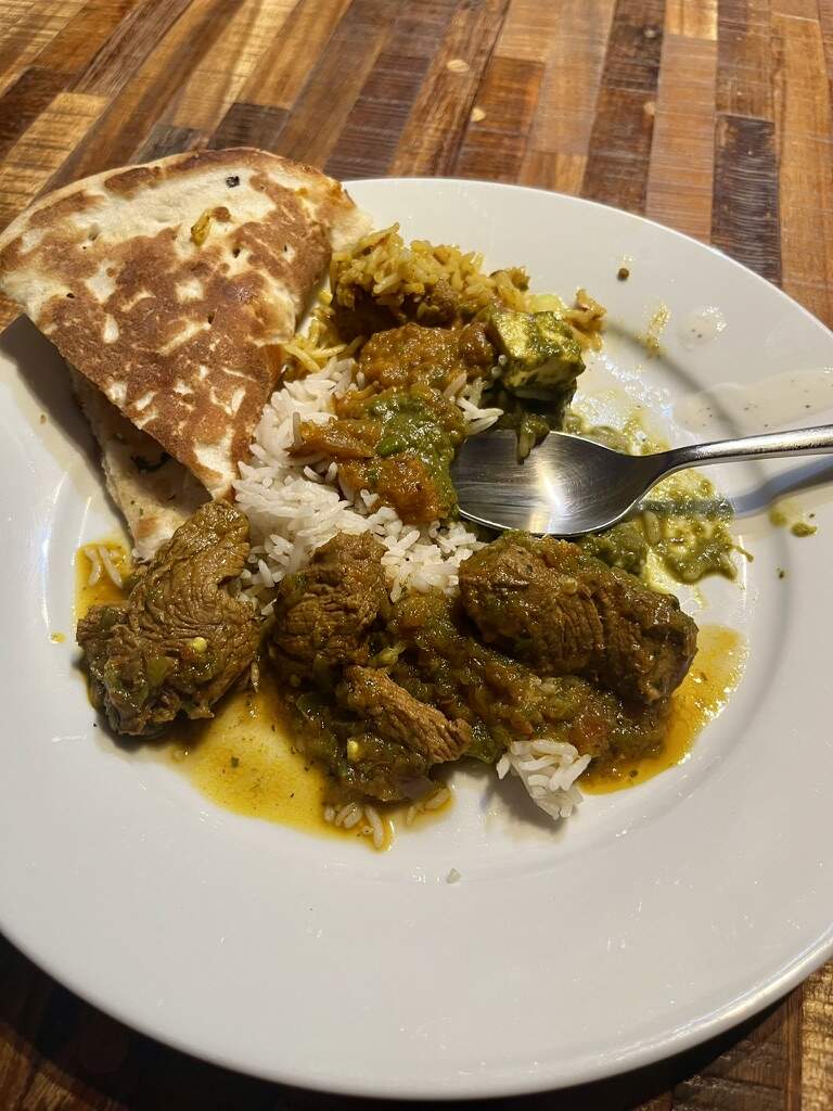 Our first choice, the most popular Indian place in town wasn’t taking any orders when we were ready to get food, so we picked another with which we’d had mixed results in the past. Last night it was really very good, so much so that we want to go back and explore some of the items unfamiliar to us (like their Indo-Chinese dishes, or an entire page of parantha variations). I’d made a note for the lamb curry to be “desi hot, or how you would cook for your mom,” and it might have been The Best Lamb curry I’ve had in this town — complex, and with a nice kick. A little too hot for some of our guests