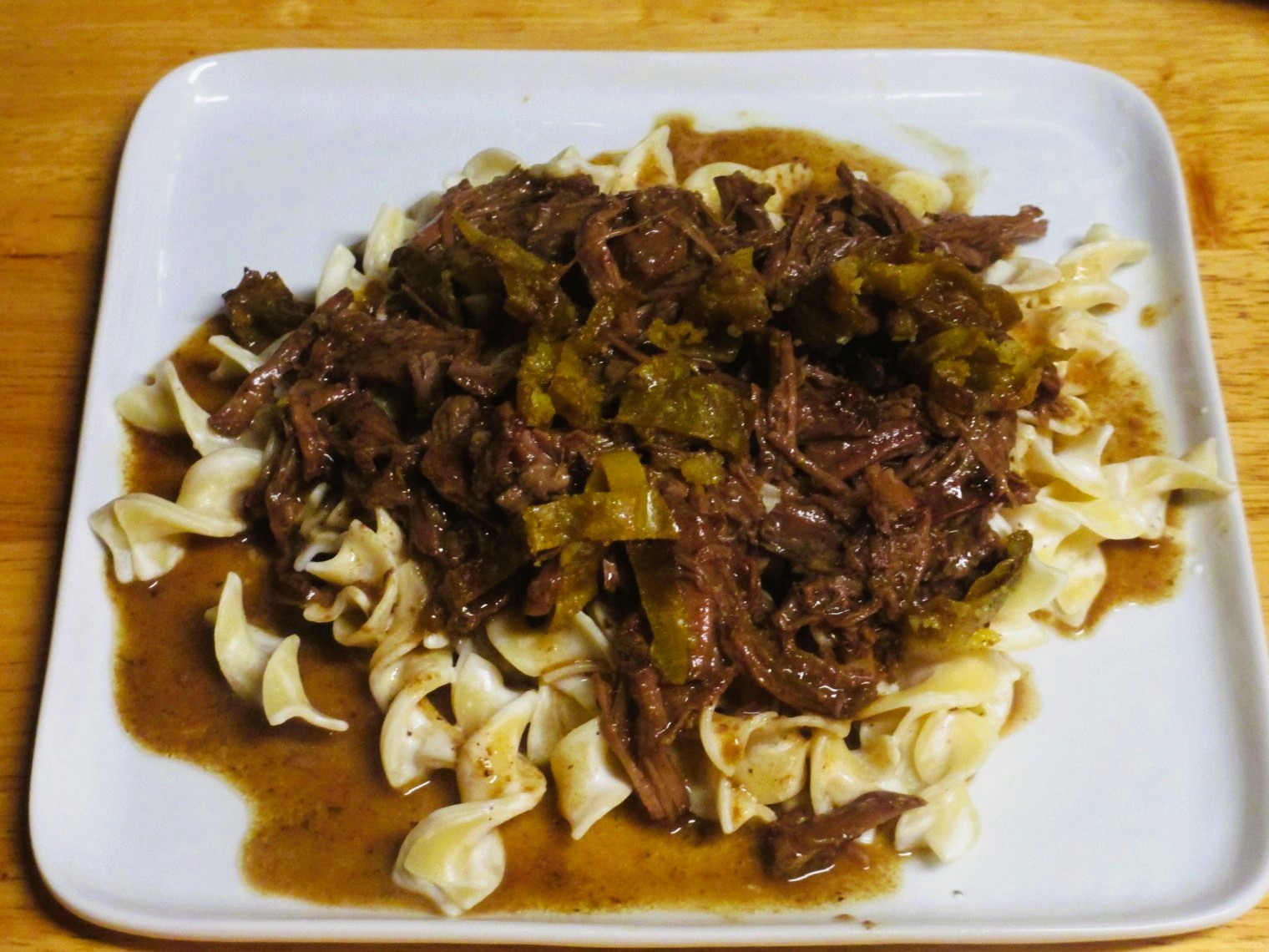 I was wondering what to do with the other half of the chuck roast and then @linguafood reminded me of Mississippi pot roast. Served over egg noodles, red and little gem lettuce, green onion, radish, avocado, cambozola, ranch dressing salad.