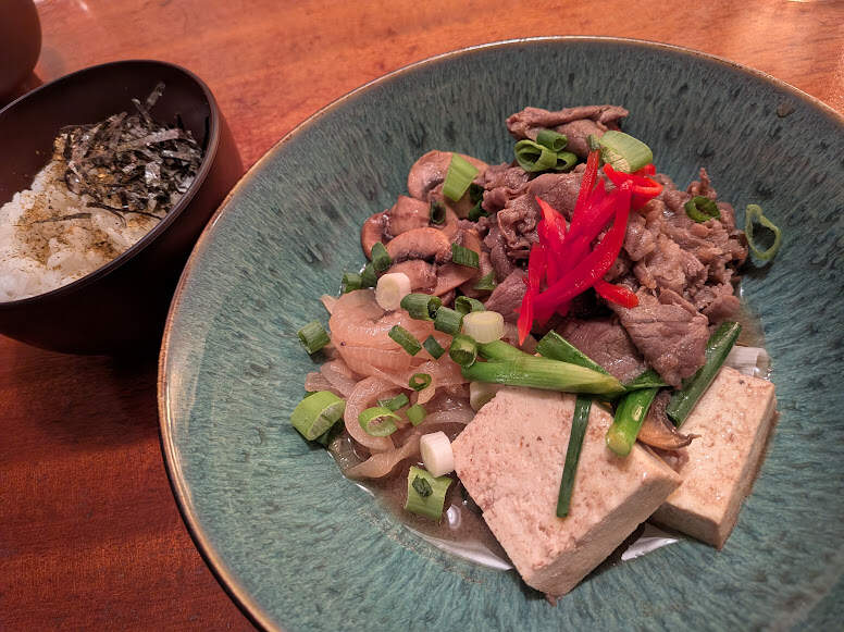 Tues., at my request, BF made us Niku dofu with thinly sliced rib eye and shrooms. Delish.