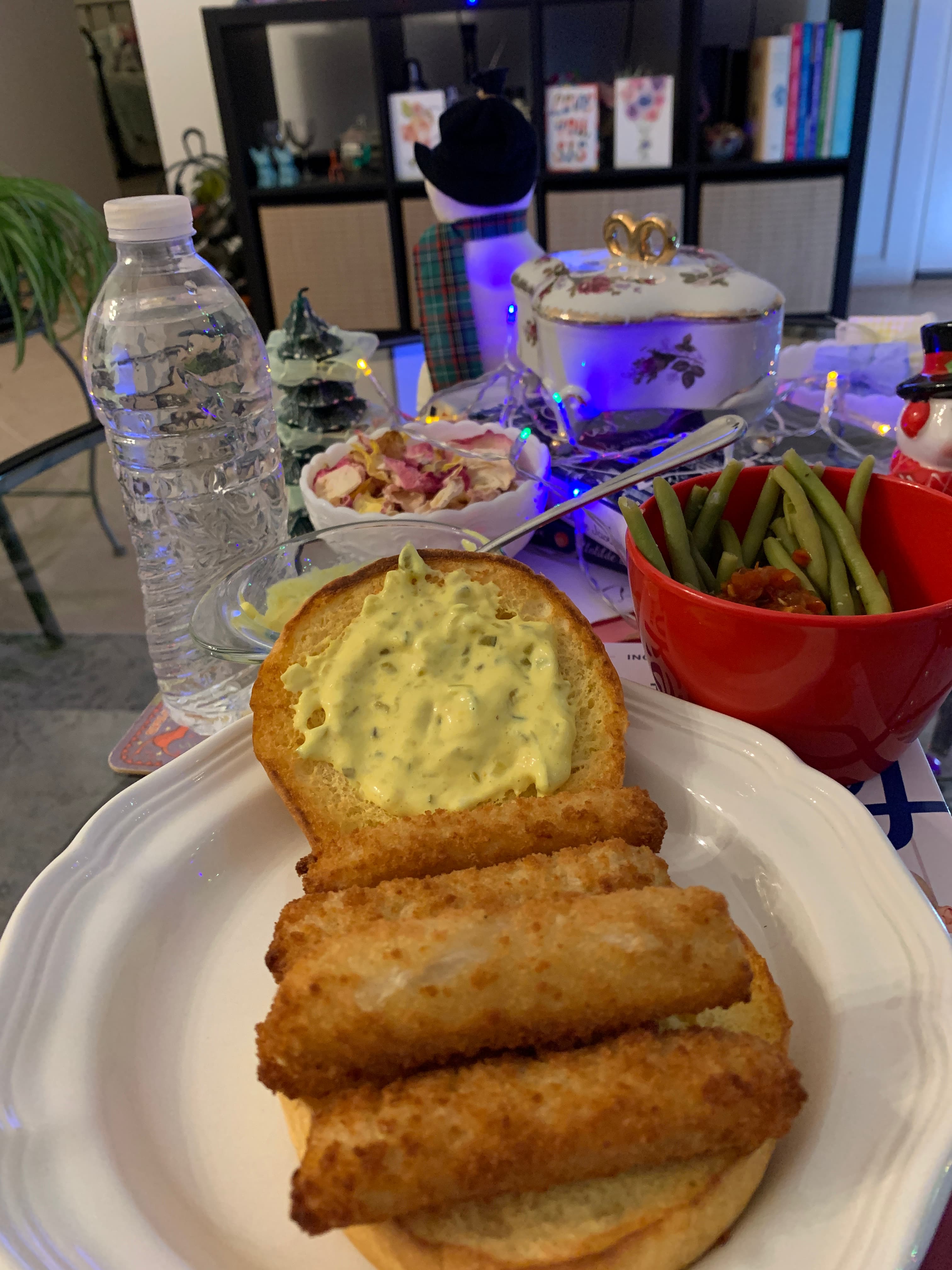 Fish sticks on a toasted brioche bun with tartar sauce and a side of Trader Joe’s haricots verts with a dab of garlic chili sauce.