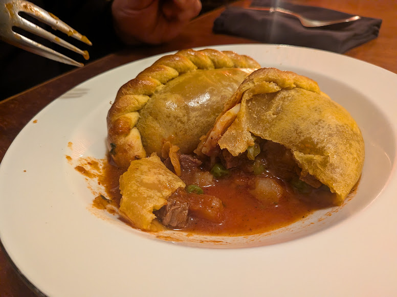 Monday night, for him, salteñas (Bolivian meat pies) we brought back from L.A. for him - super juicy, but a little too tomatoey for us - which is not the norm. Still, they scratch our Bolivian itch. He made a big salad for me with fried, diced potatoes. yummy.
