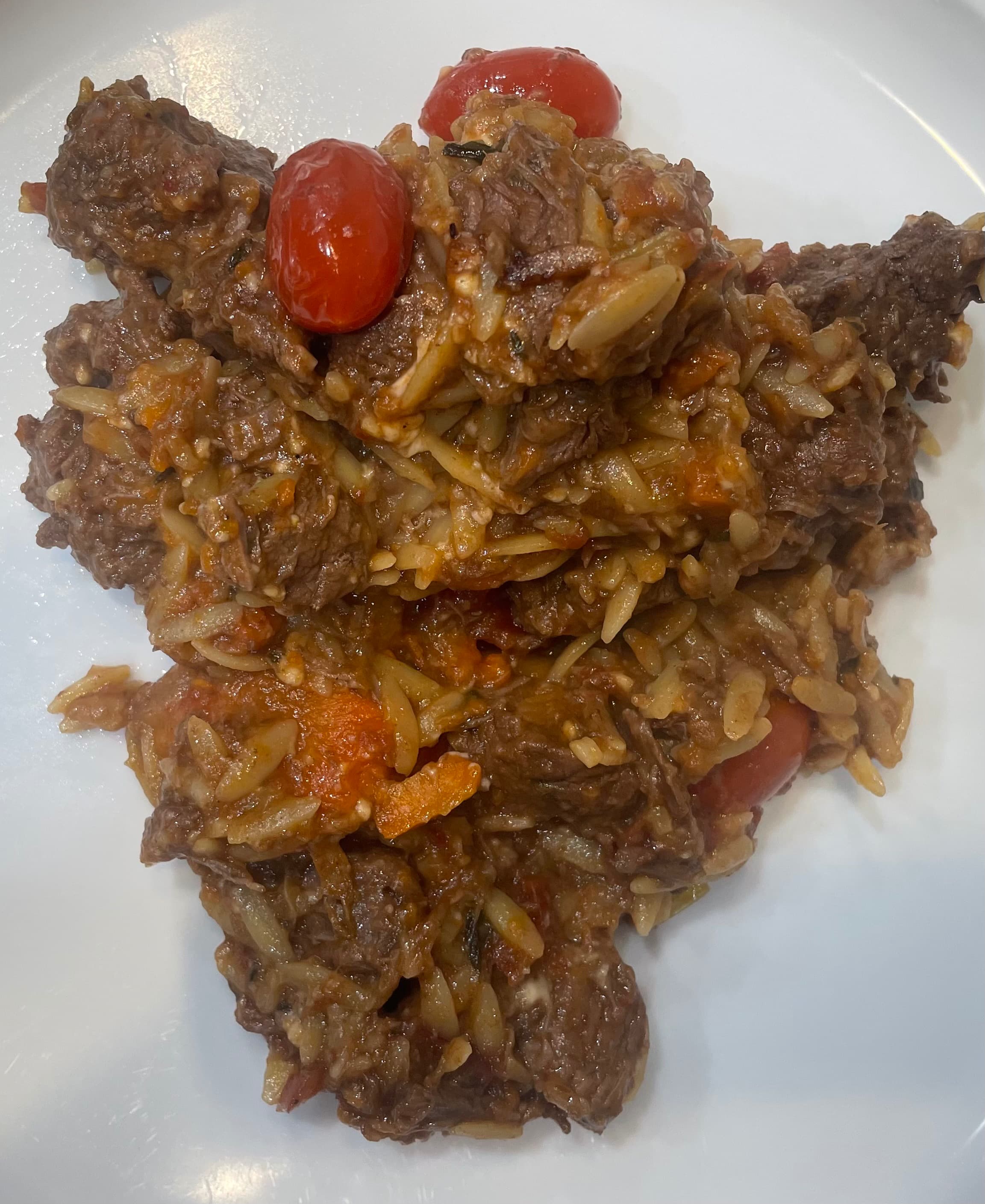 Greek-inspired Lamb Stew with Kritharaki/Orzo - stew was cooked in the oven with cubed leg of lamb, carrots, celery, red onion, oregano, thyme, cinnamon stick, bay leaves, cumin seeds, red wine, diced tomatoes and beef broth. For the last 20 minutes you add orzo and cherry tomatoes and finish with feta.