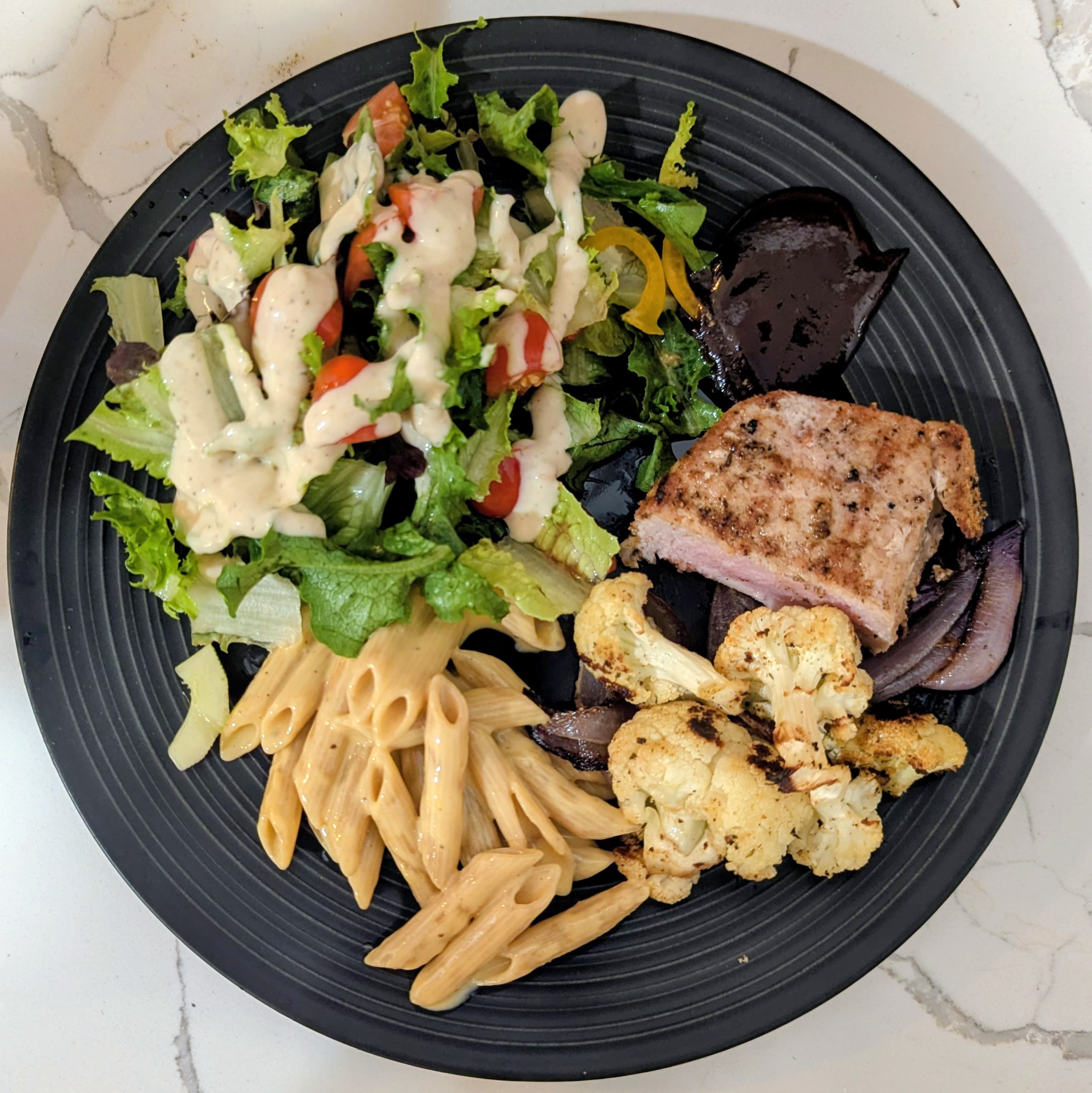 We’re visiting family in the Midwest and made dinner at my MIL’s tonight after hemorrhaging cash eating out the last few days. Grilled pork chop, ww penne and cheese, green salad, and roasted cauliflower and red onion. Given the limited kitchen and dusty spices we had to work with, I’m going to say it was better than expected.