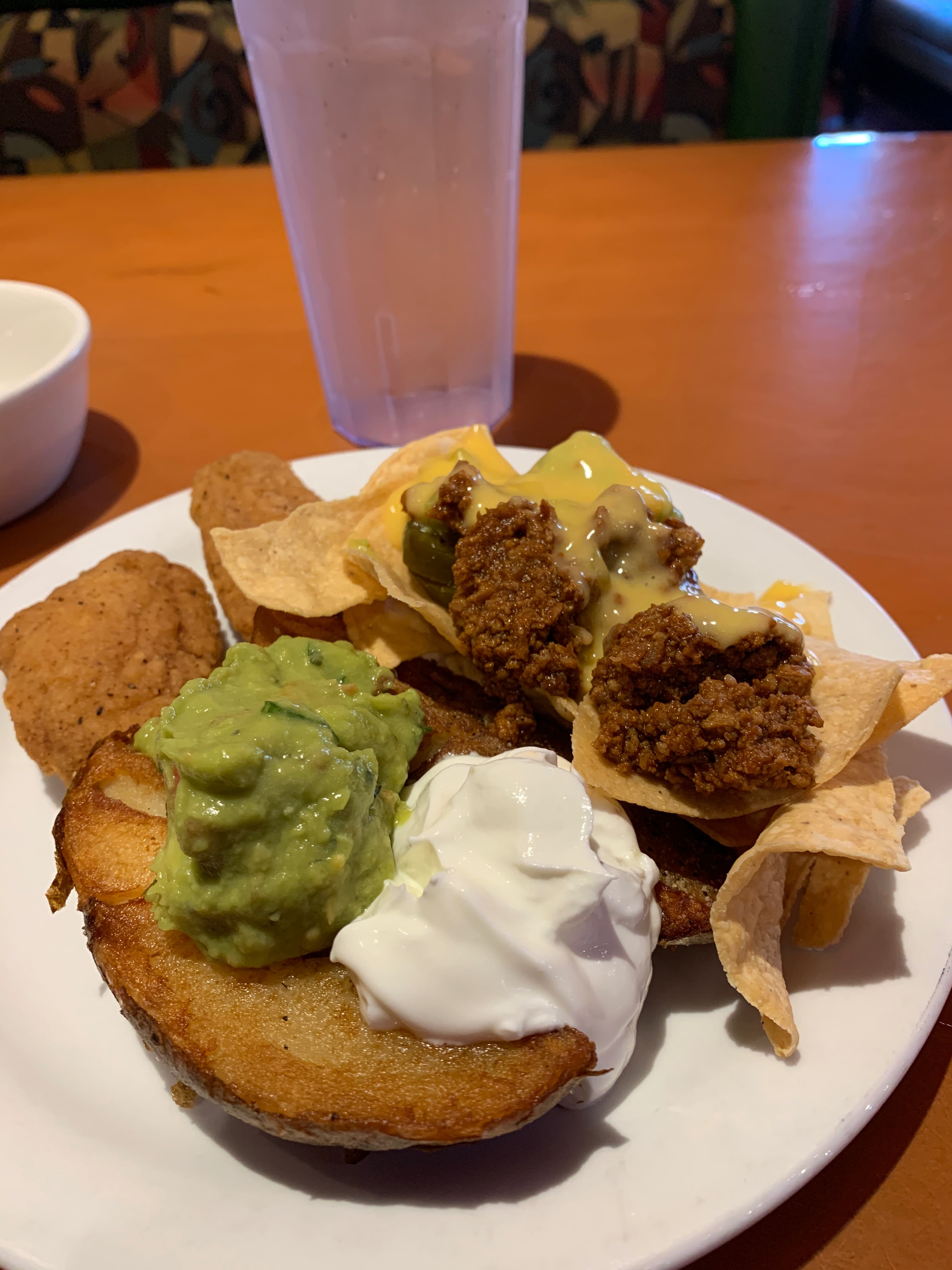 Potatoes, chicken wings, “nachos”.