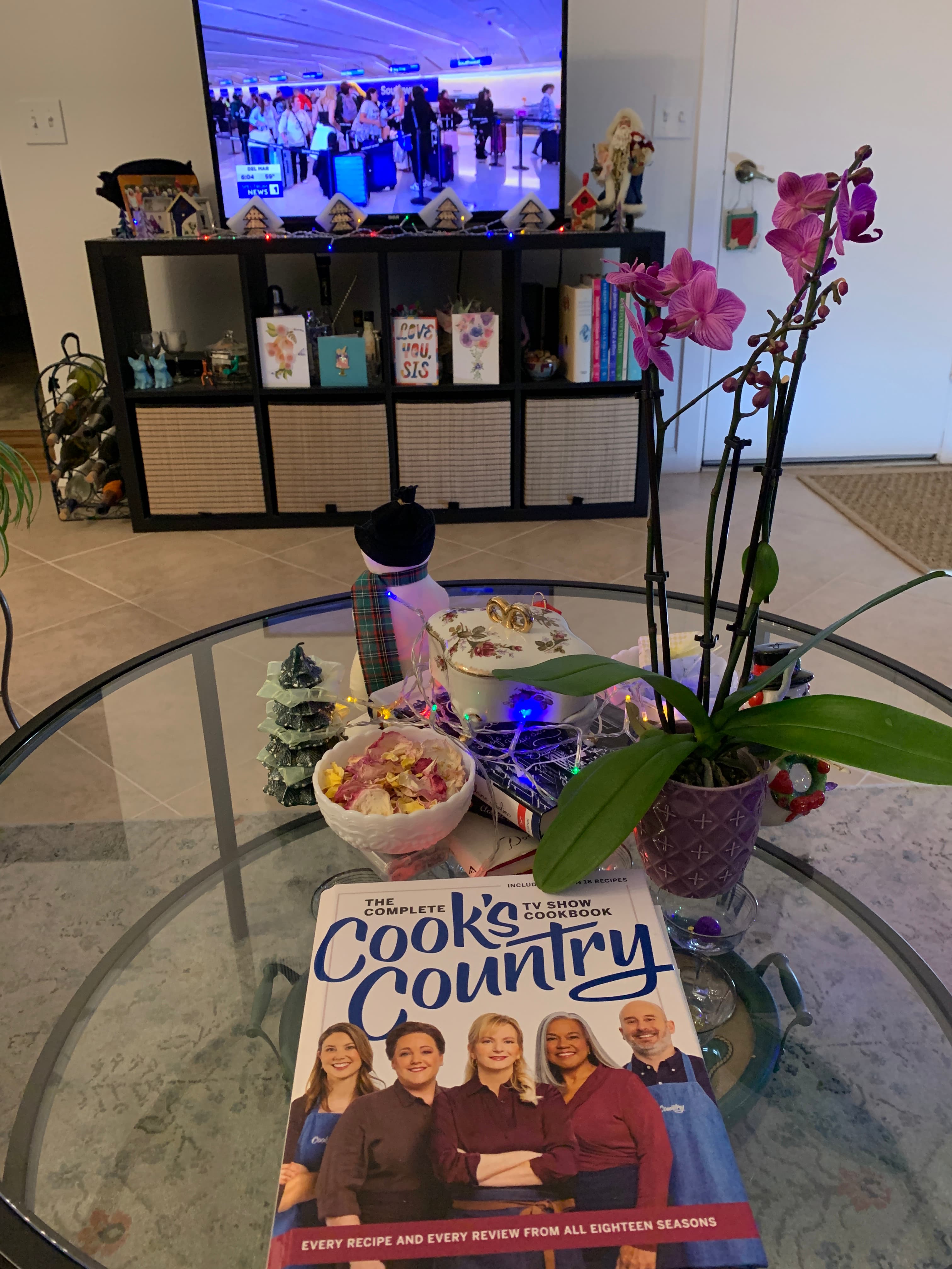 Thank you so much! You are too kind. If you are talking about the covered dish, it holds butterscotch hard candy. The other dish has dried rose petals because I hate to throw away my roses when they wilt. This is my coffee table in my living room. I like to eat in front of the TV like an uncivilized person.