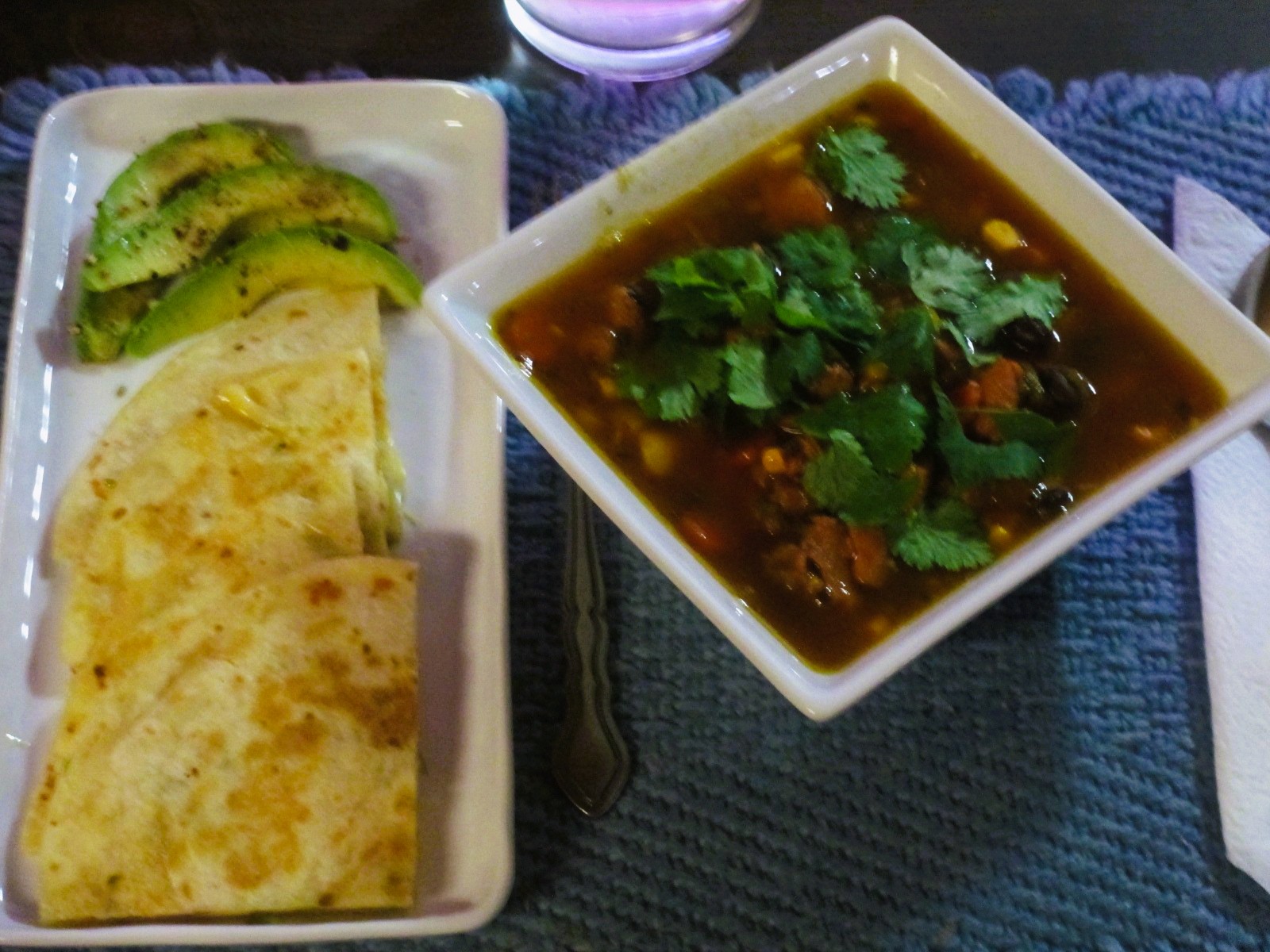 Sopa de pollo. Chicken thigh, onion, garlic, celery, carrot, Hatch chile, chicken broth, black beans, corn, sazón and cilantro. Three cheese (extra sharp cheddar, pepper jack, Manchego) and pickled jalapeno quesadilla, avocado. A Margarita because it’s Tuesday.
