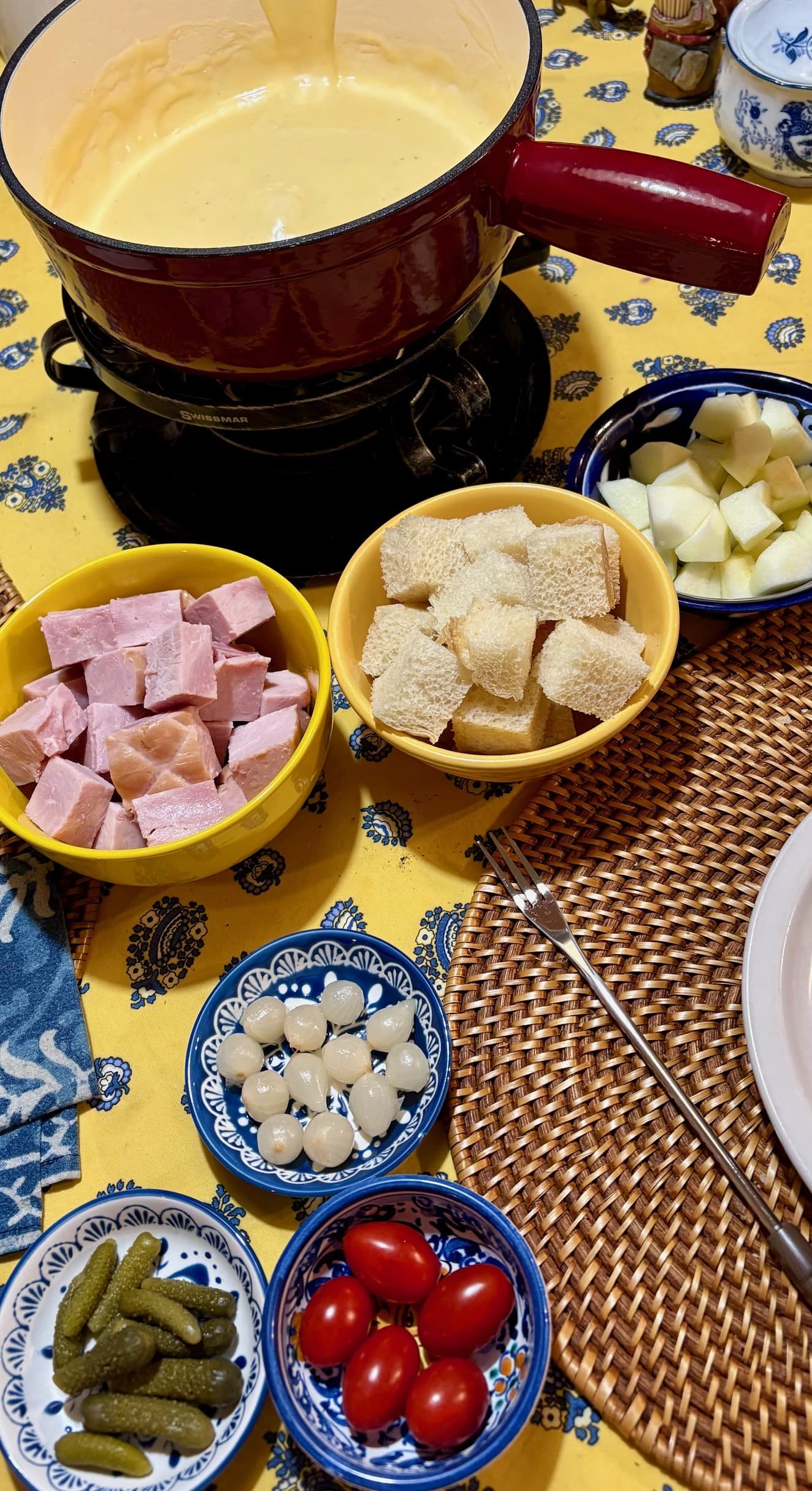 Dippers included cooked ham, homemade French bread, tart garden apples (Granny Smith), grape tomatoes, pickled onions, and cornichons.