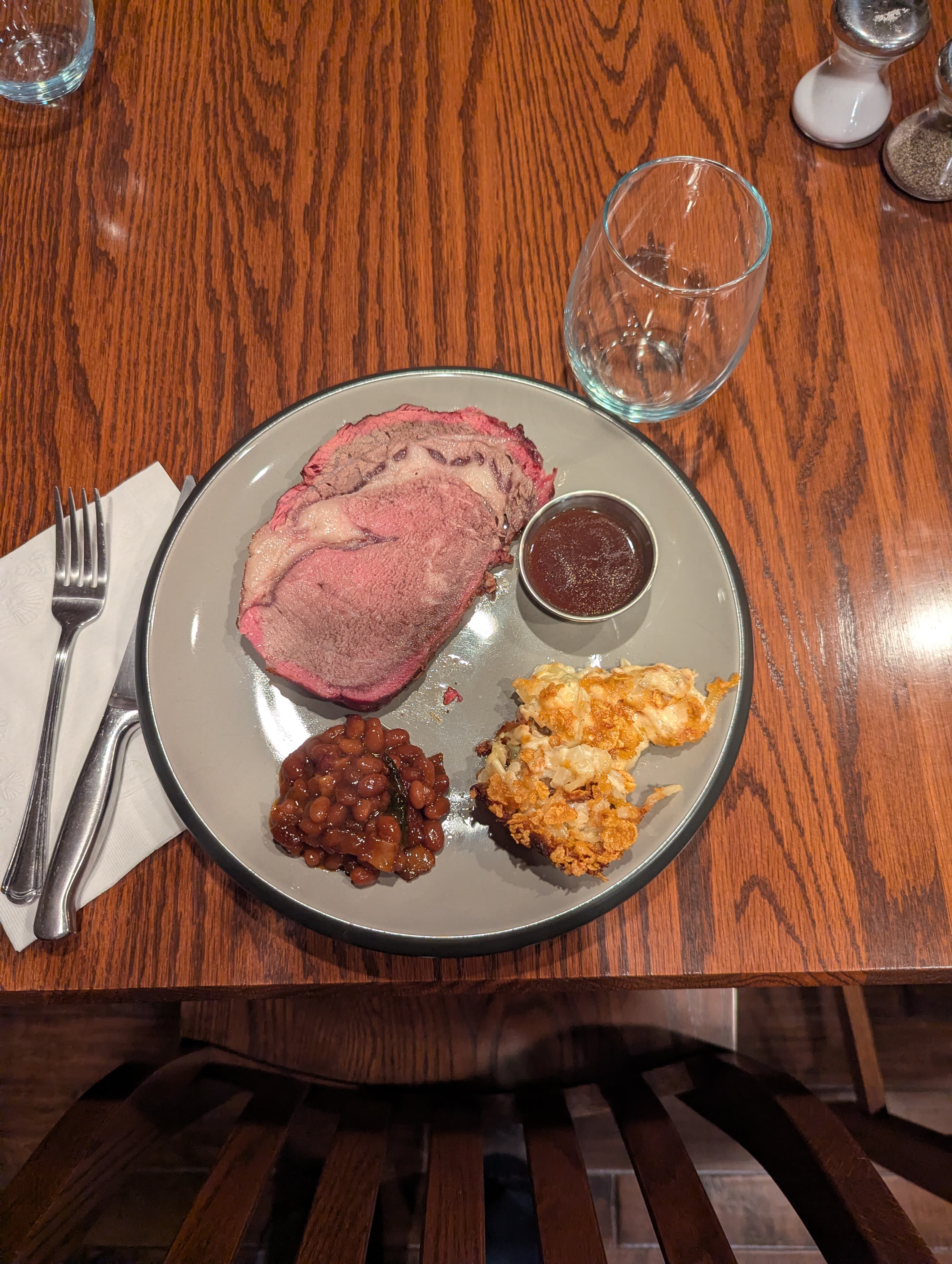 Smoked prime rib, smoked baked beans, and funeral potatoes. I supplied the wine and bourbon (both excellent if I say so