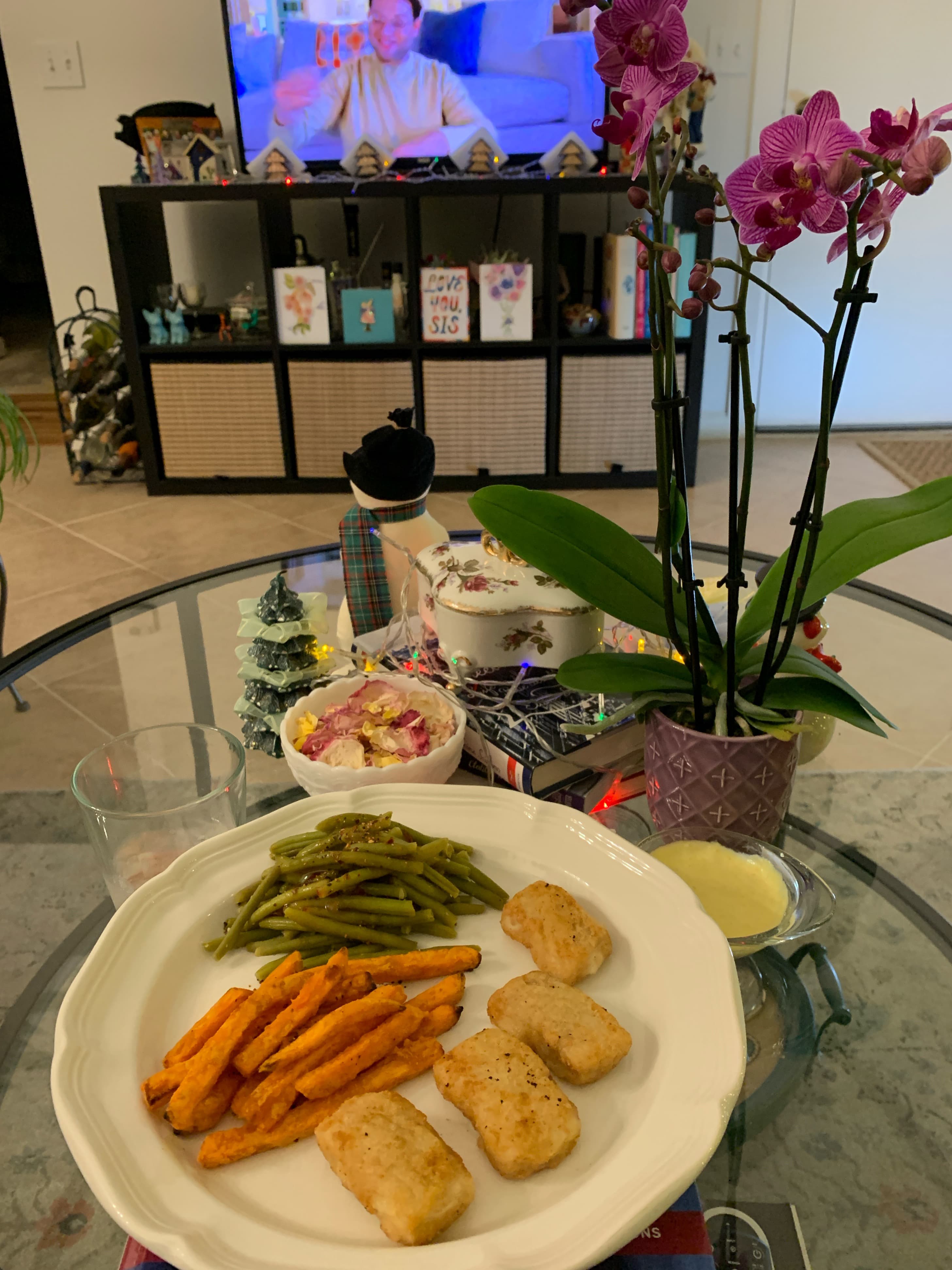 Fish nuggets, tartar sauce, sweet potato fries, cold haricots dressed with sweet chili sauce, tequila, and sparkling lemonade. Everything from Trader Joe’s Tartar sauce was too sweet and lemonade was not sweet enough but everything else was good. Oh, and blood work came back with great results so I’m splurging again. ![]()