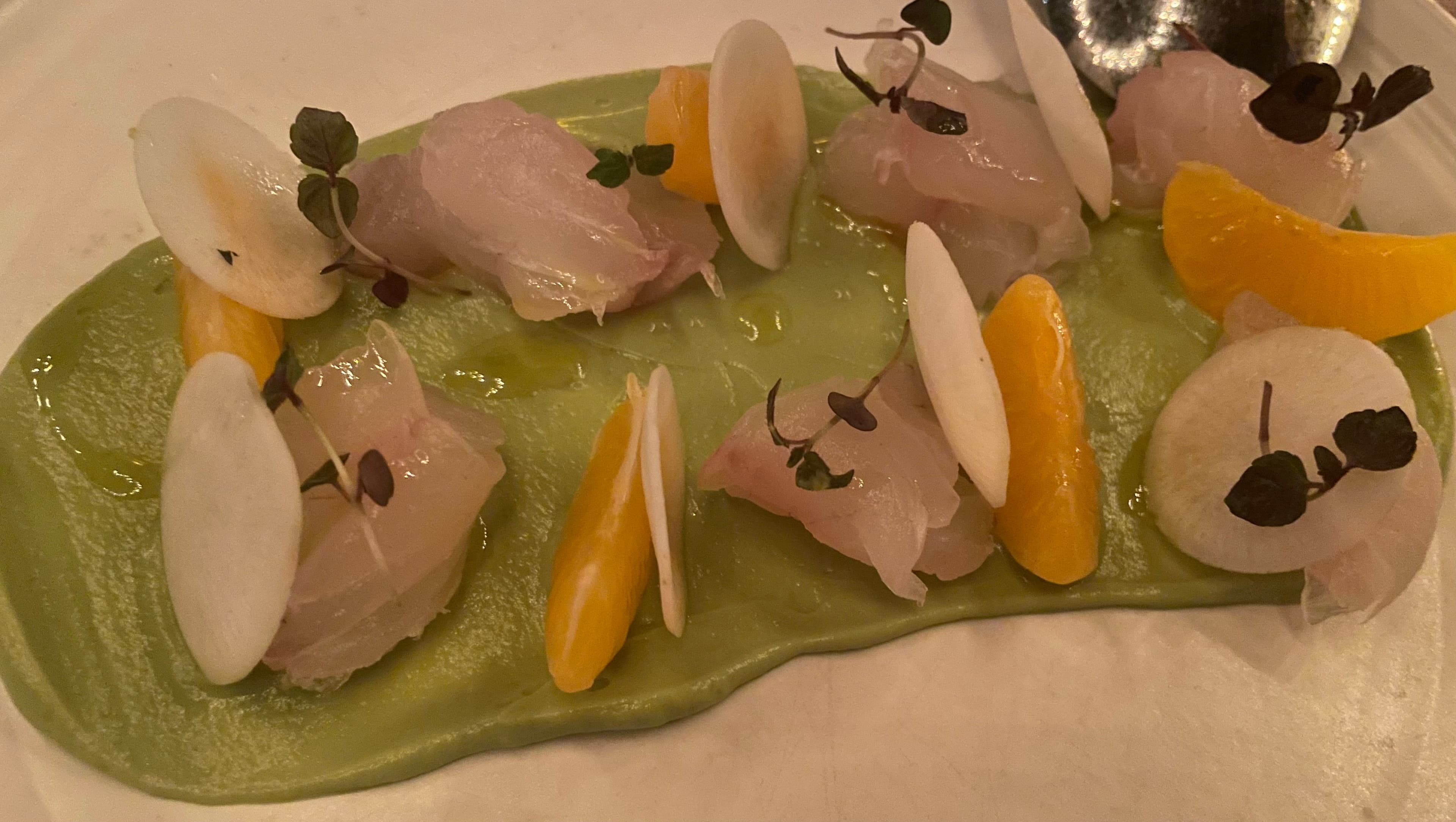 Line caught halibut crudo, carpinteria avocado mousse, “regier farms” tangerine, young turnip, agrumato olive oil, red shiso