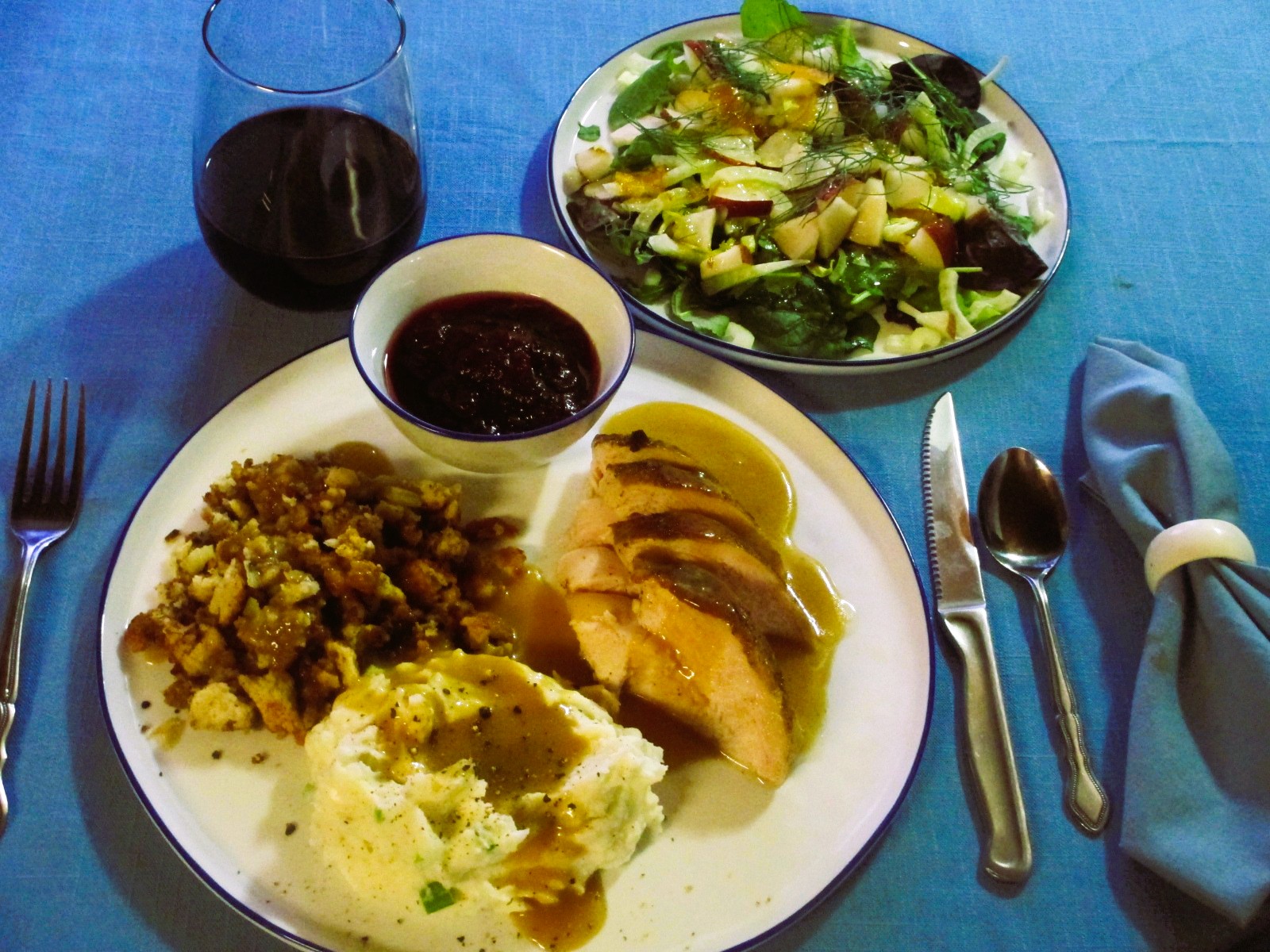 My dinner was turkey breast, Pepperidge Farms dressing with leeks and celery, mashed potatoes with butter, sour cream and green onion, gravy made from turkey drippings, flour and turkey broth, whole berry cranberry sauce from the can. Salad was mixed baby greens, fennel, celery, red Anjou, orange marmalade, rice vinegar and oo dressing. Cocktail was a maple syrup Manhattan and there was wine with.