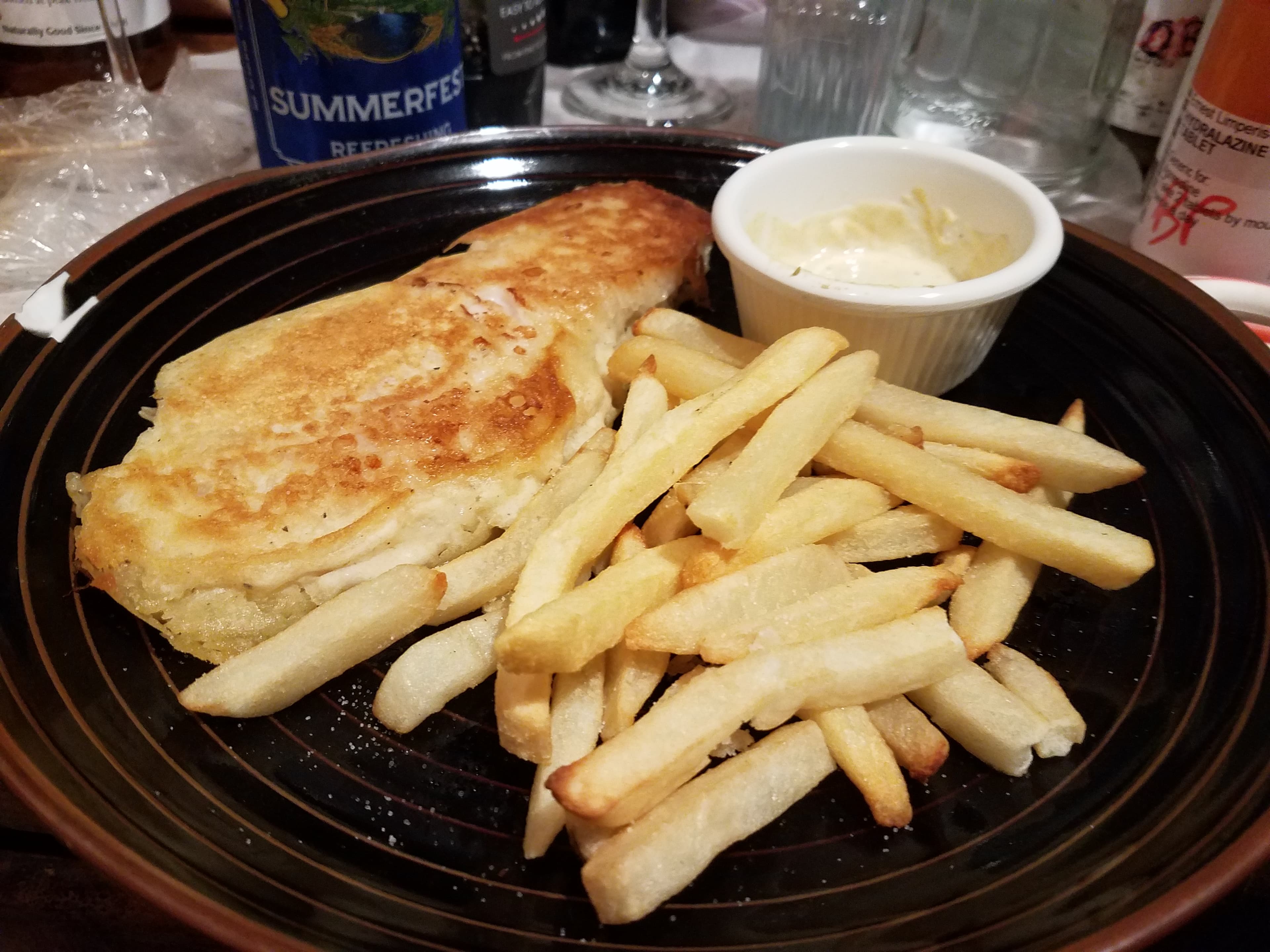 A first try at beer-battered cod, with chips. The crust was nice and crisp, but very thin even though the batter was thick. The fish was flaky and soft. More research is needed. With meyer lemon dijonnaise.