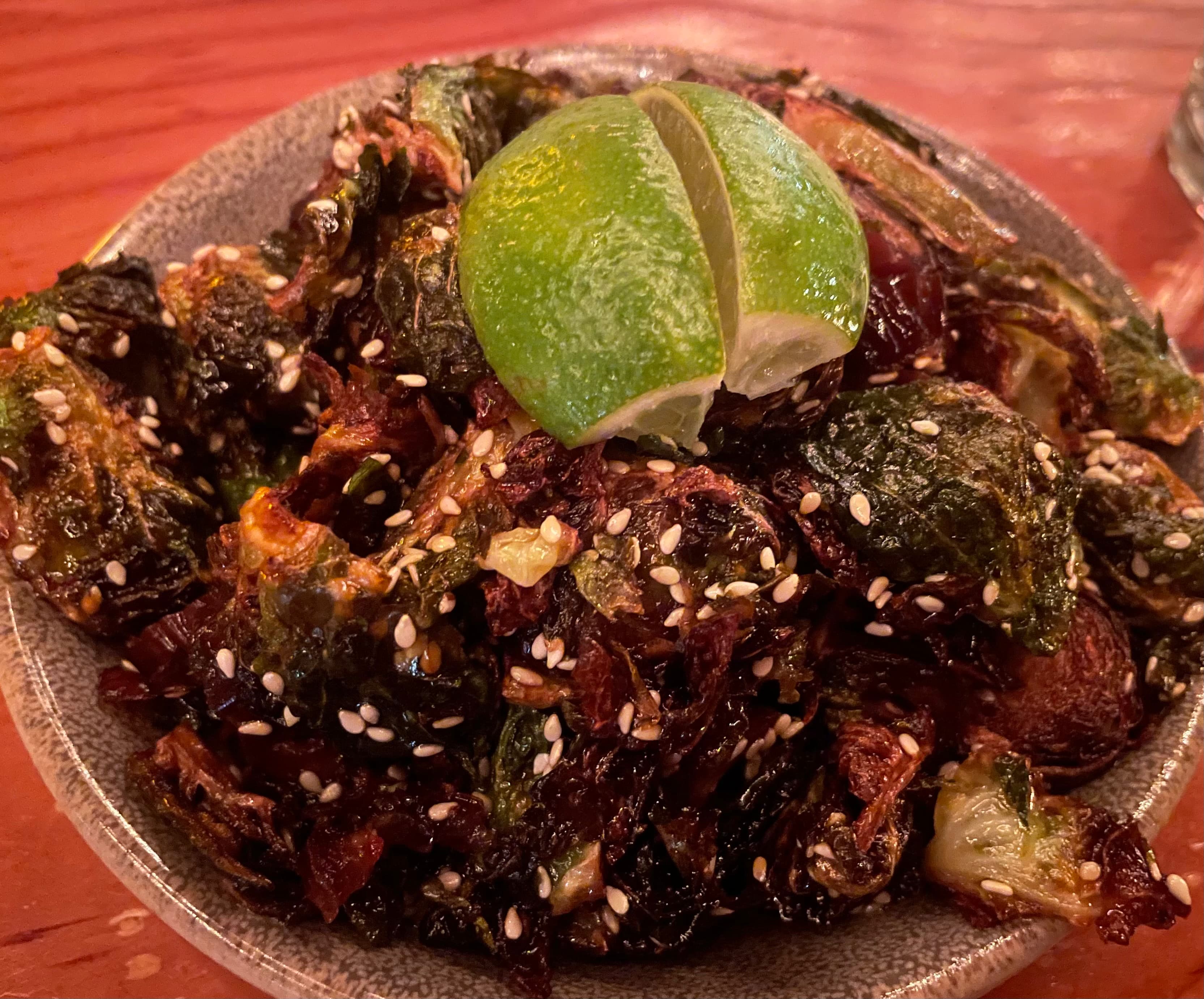 Crispy Brussels sprouts, sesame, garum, medjool dates, lime