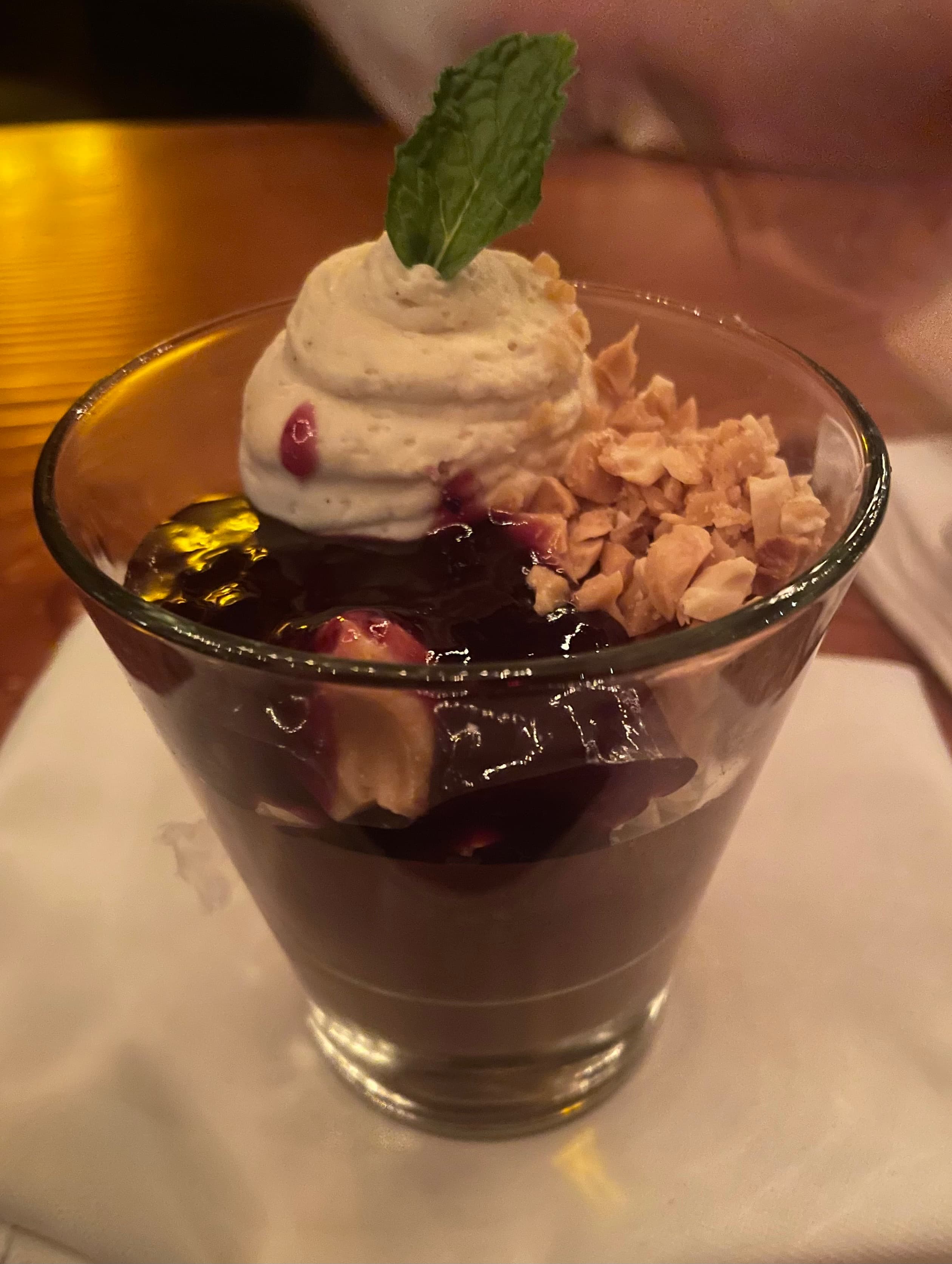 Valrhona dark chocolate pot de creme, peanut butter mousse, thomcord grape jam, peanut brittle