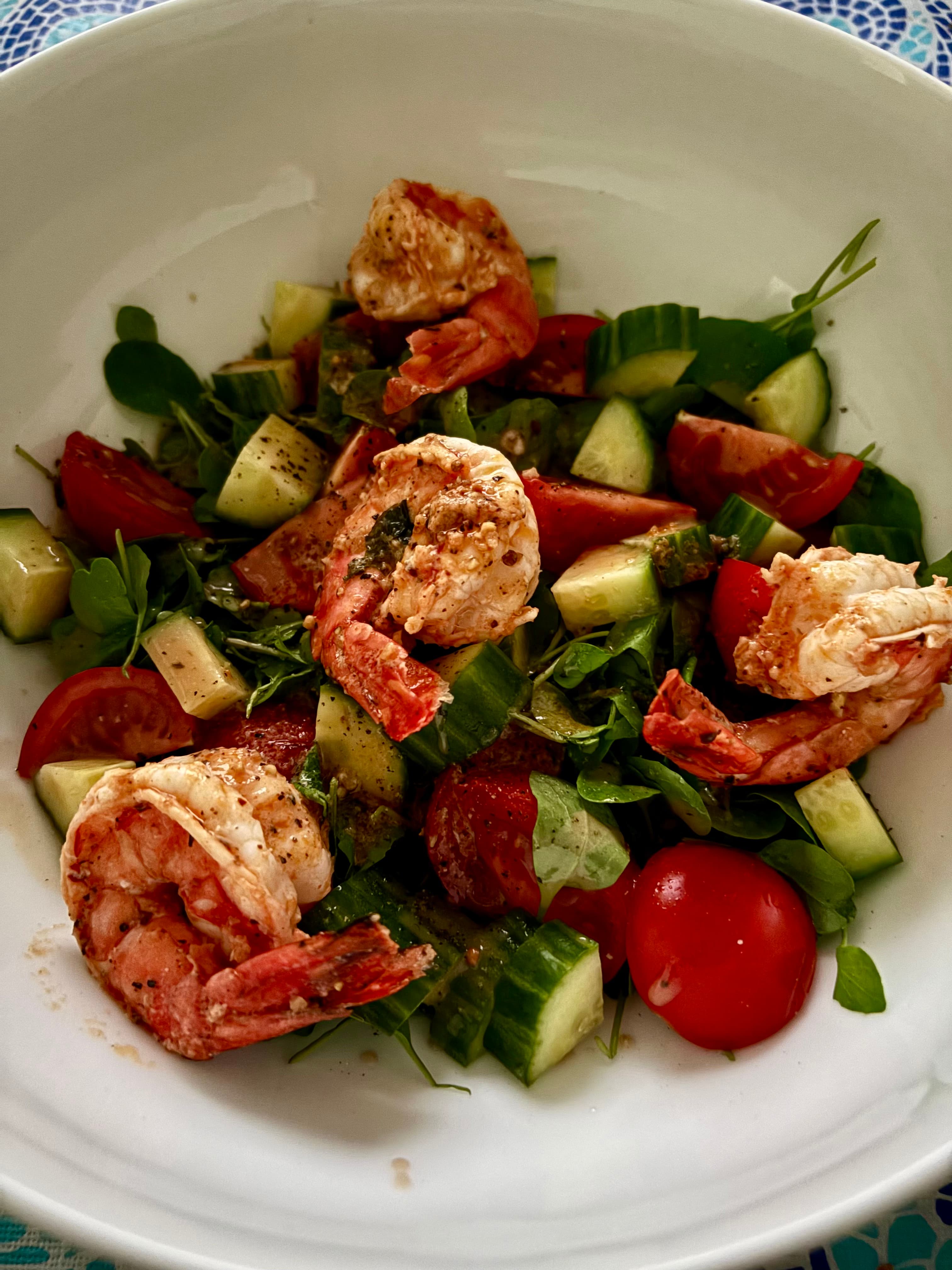 Spicy sauteed black tiger shrimp(16/20) and rocket salad with cocktail tomatoes and cucumber. Red wine vinaigrette