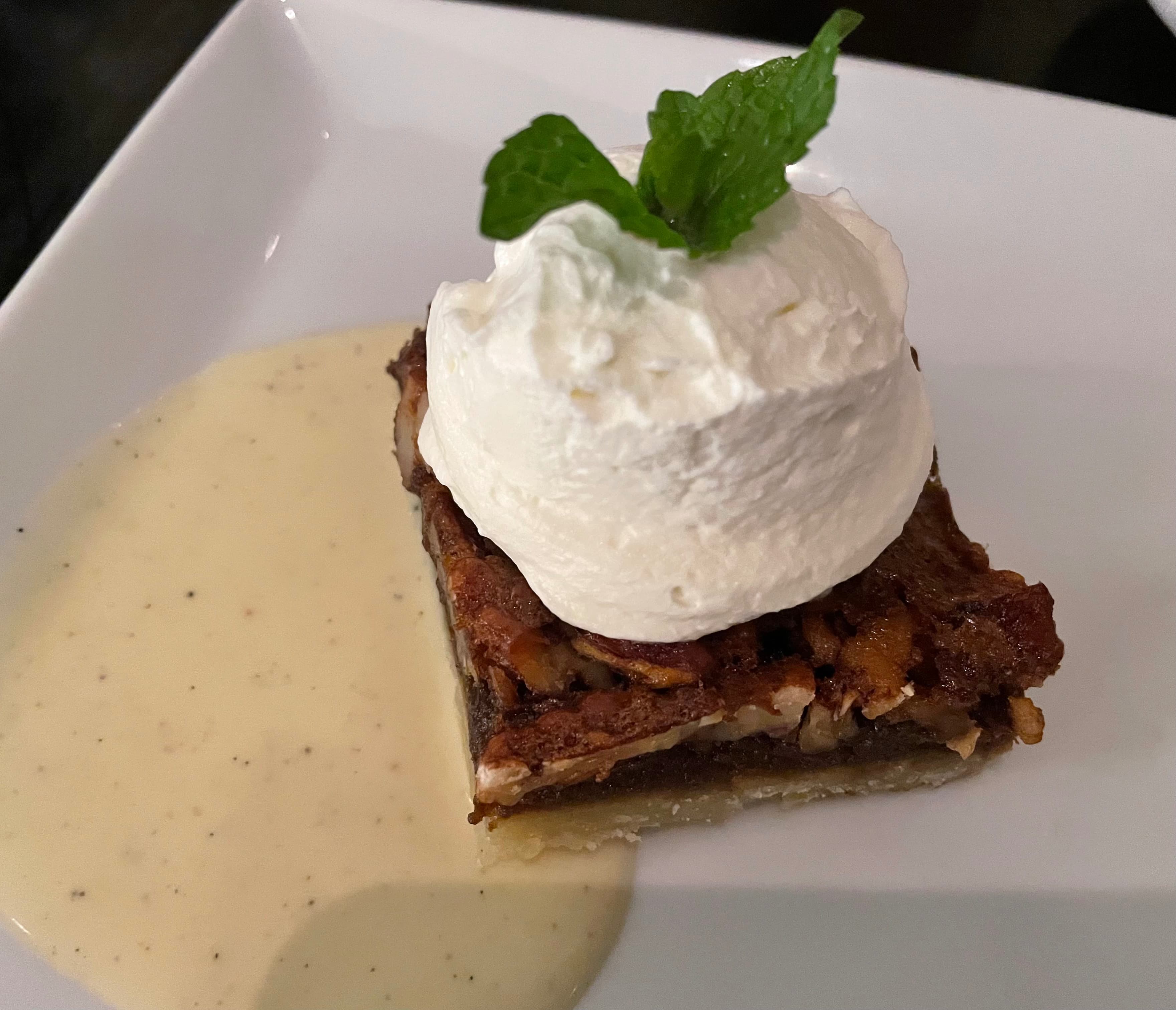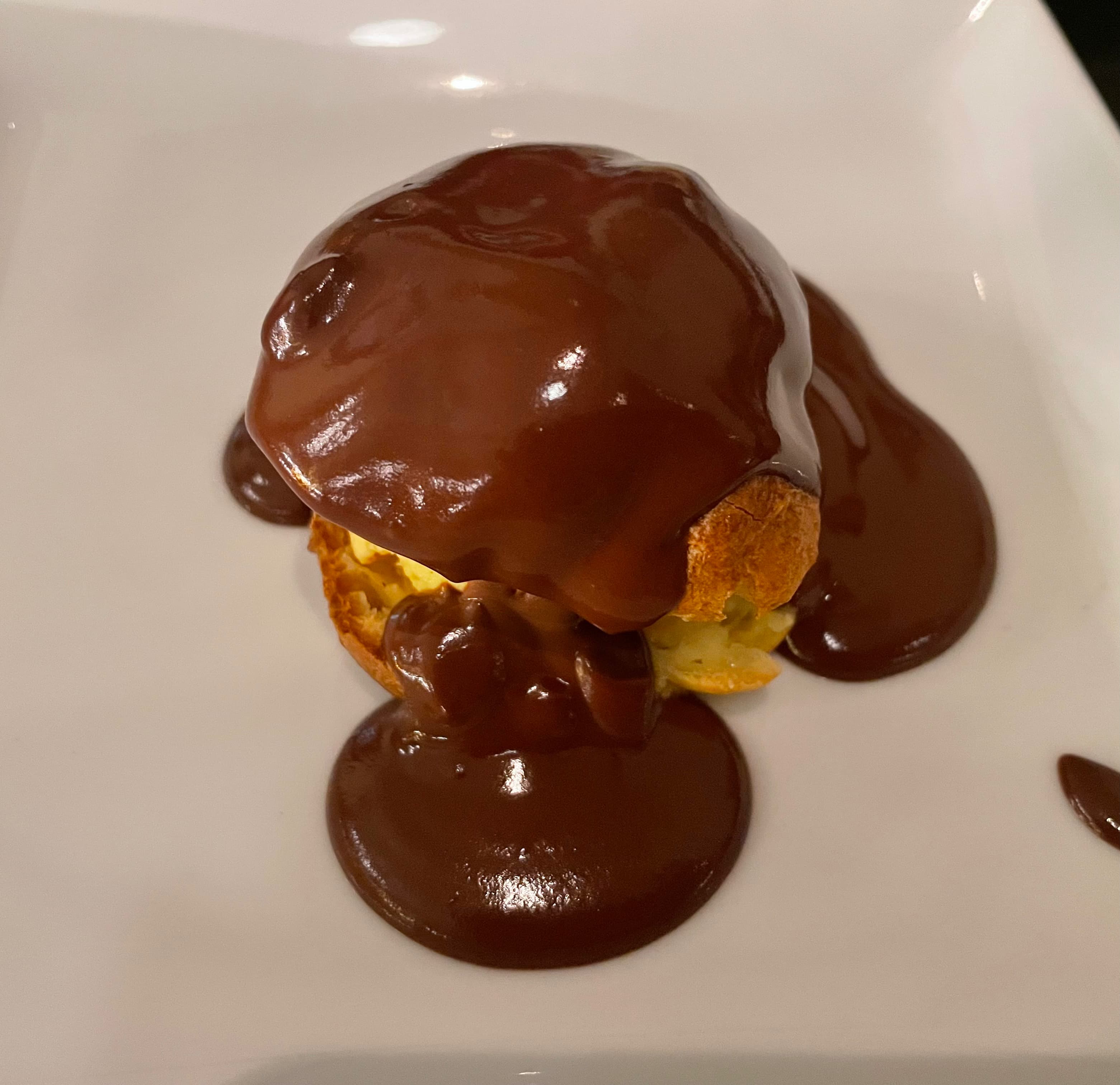 Profiterole, egg nog creme anglaise, chocolate drizzle, pumpkin ice cream