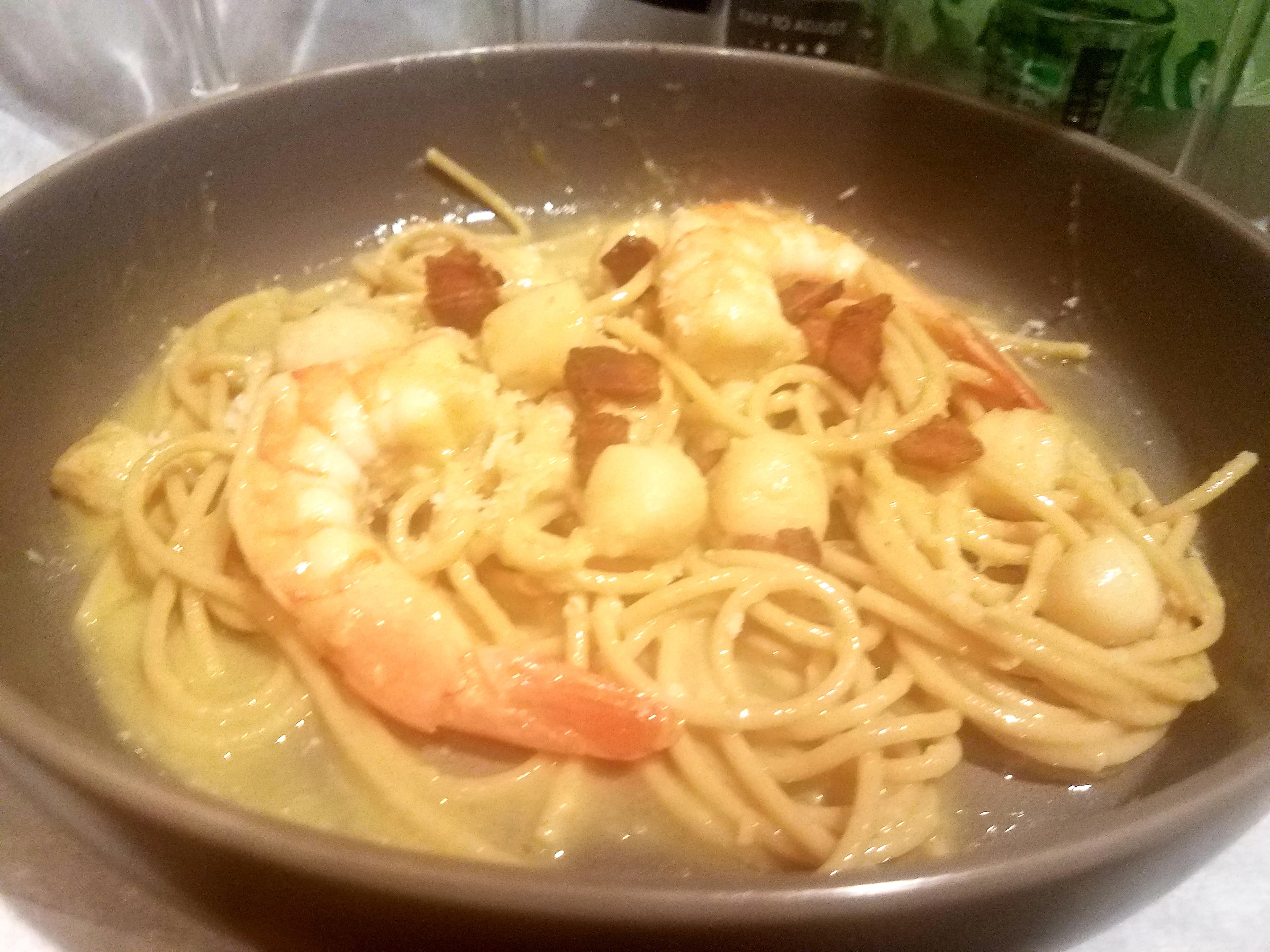 Awful photo of a really good Thanksgiving spaghetti carbonara, with shrimp, bay scallops, bacon, and chanterelles.