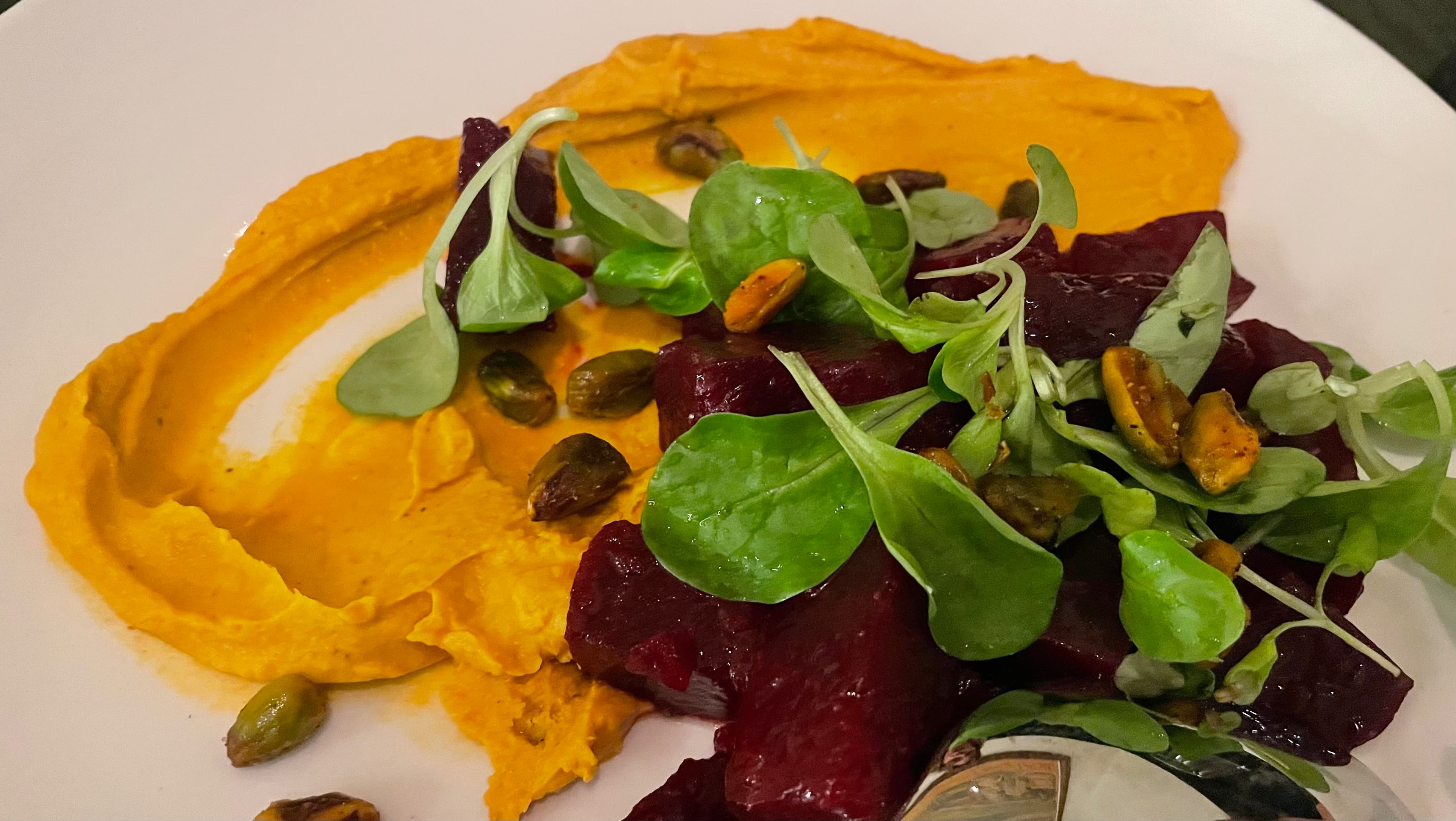 Salt roasted beets, sweet potato puree, mache greens, spiced pistachio crumbles