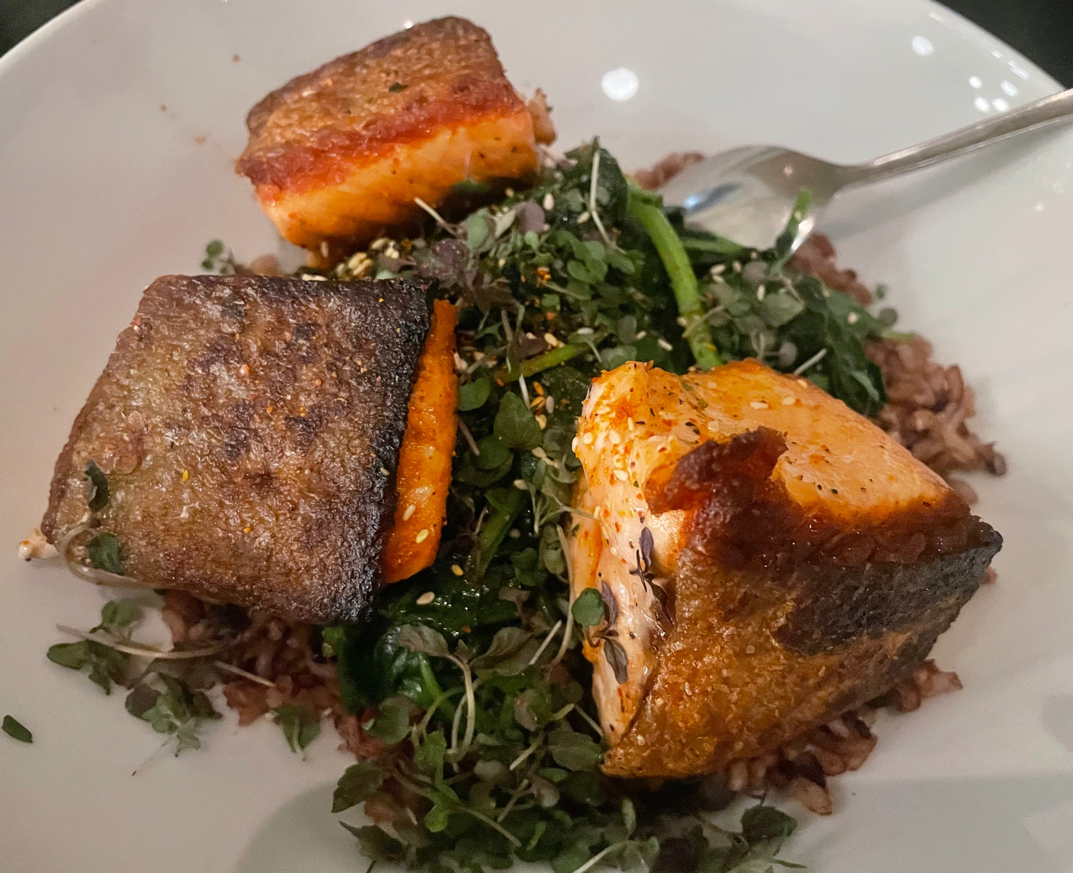 Pan seared trout, wild rice, truffle honey candied brussels sprouts, togarashi
