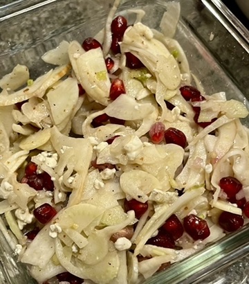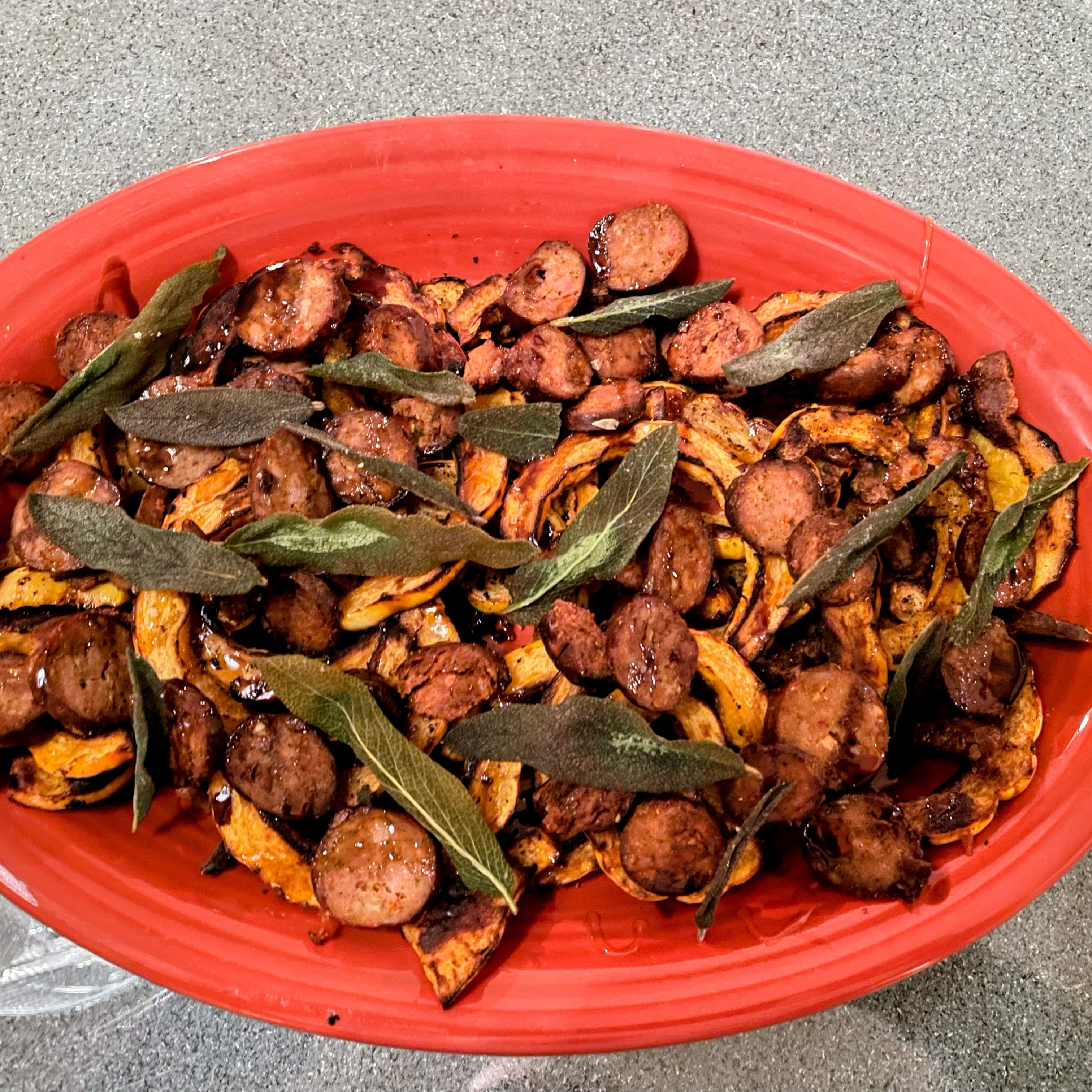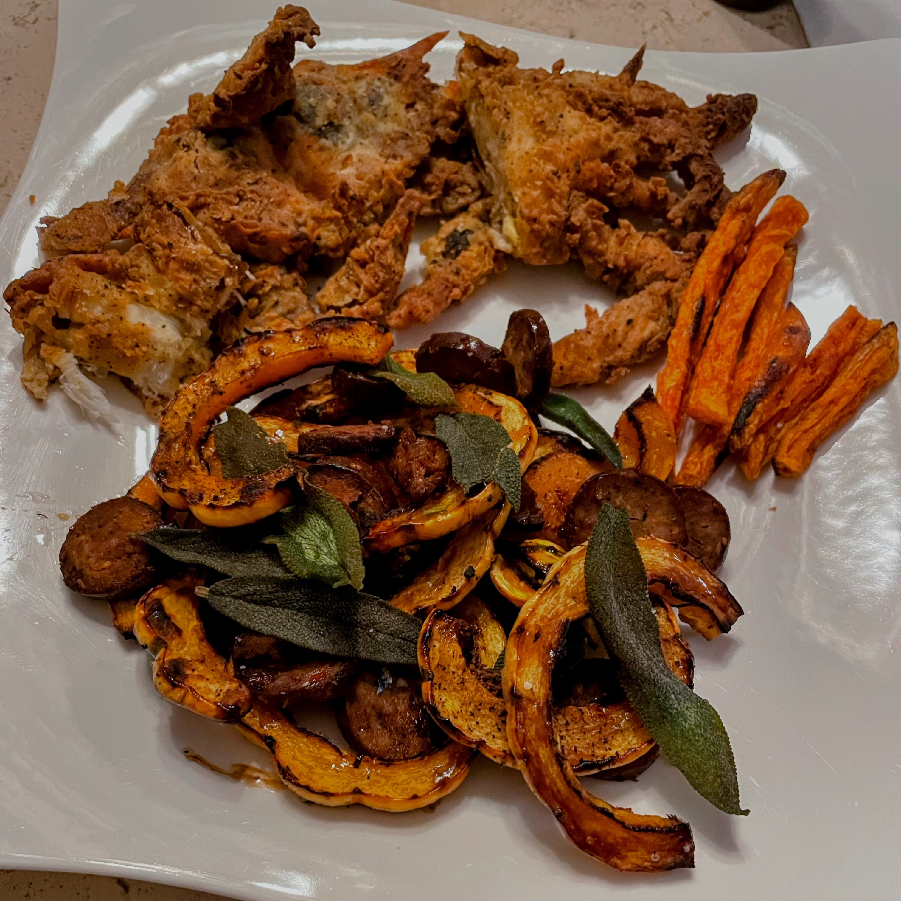 Besides the delicious fried soft shell crab and fried shrimp cocktail leftovers from last night, Mrs. P made roasted figs with gorgonzola, toasted slivered almonds, reduced balsamic and hot honey to start, and roasted delicata squash, Andouille sausage, fried home grown sage, hot honey and reduced balsamic as a side dish. It all went great with an excellent cabernet. Mrs. P added chili crisps to the cocktail and horseradish cream sauce, to give it an extra kick.