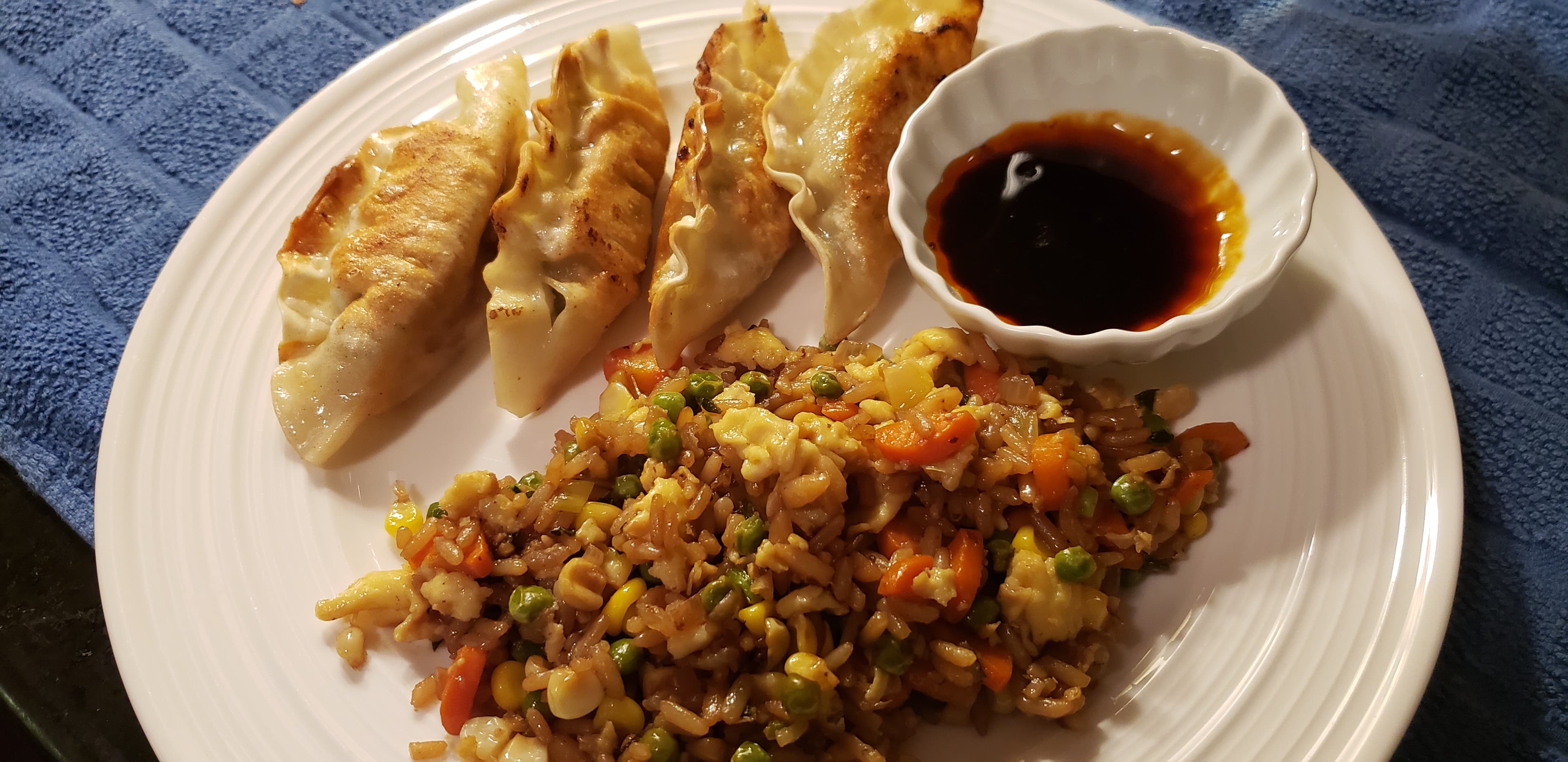 Dinner was decidedly non-Thanksgiving leftoverish: Bibigo pork & veg dumplings with Dumpling Daughter’s Spicy Sweet soy sauce as a dipping sauce, with a side of fried rice using leftover rice pilaf, and frozen peas and corn with chopped carrots, shallots and minced garlic.