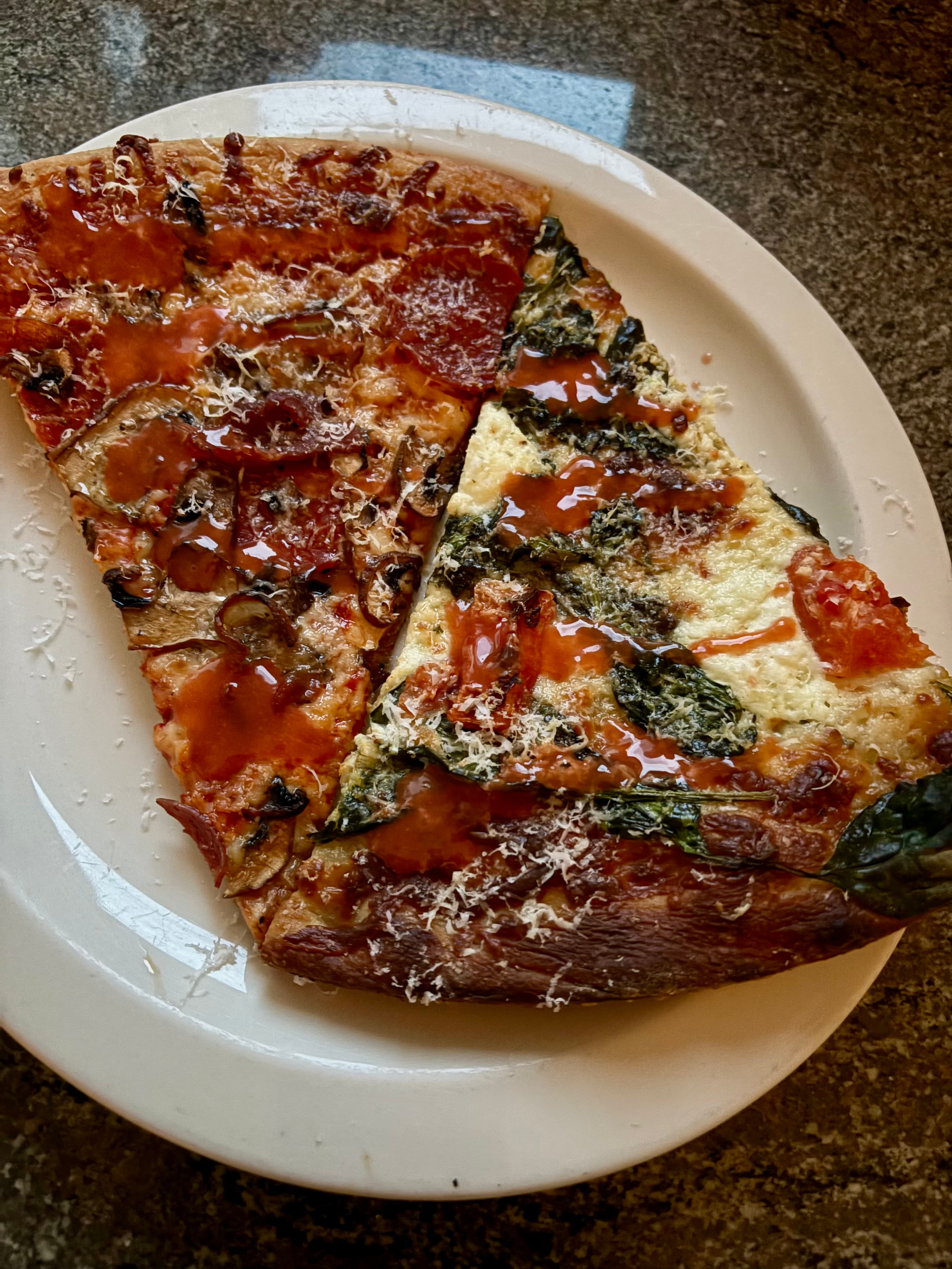 One with spinach/ricotta and tomato, the other with pepperoni ,bacon and mushrooms. I added Parm/Regg and hot sauce.