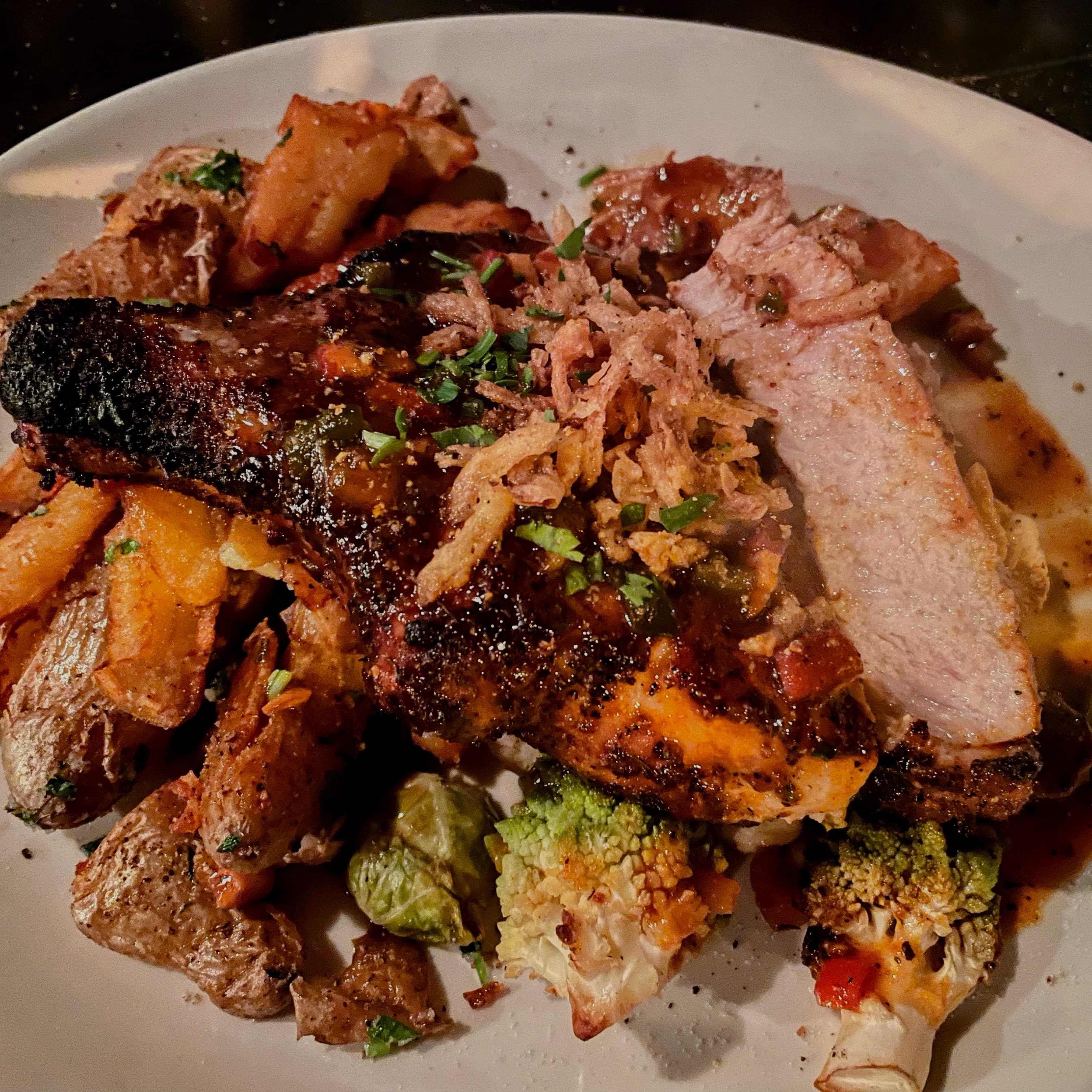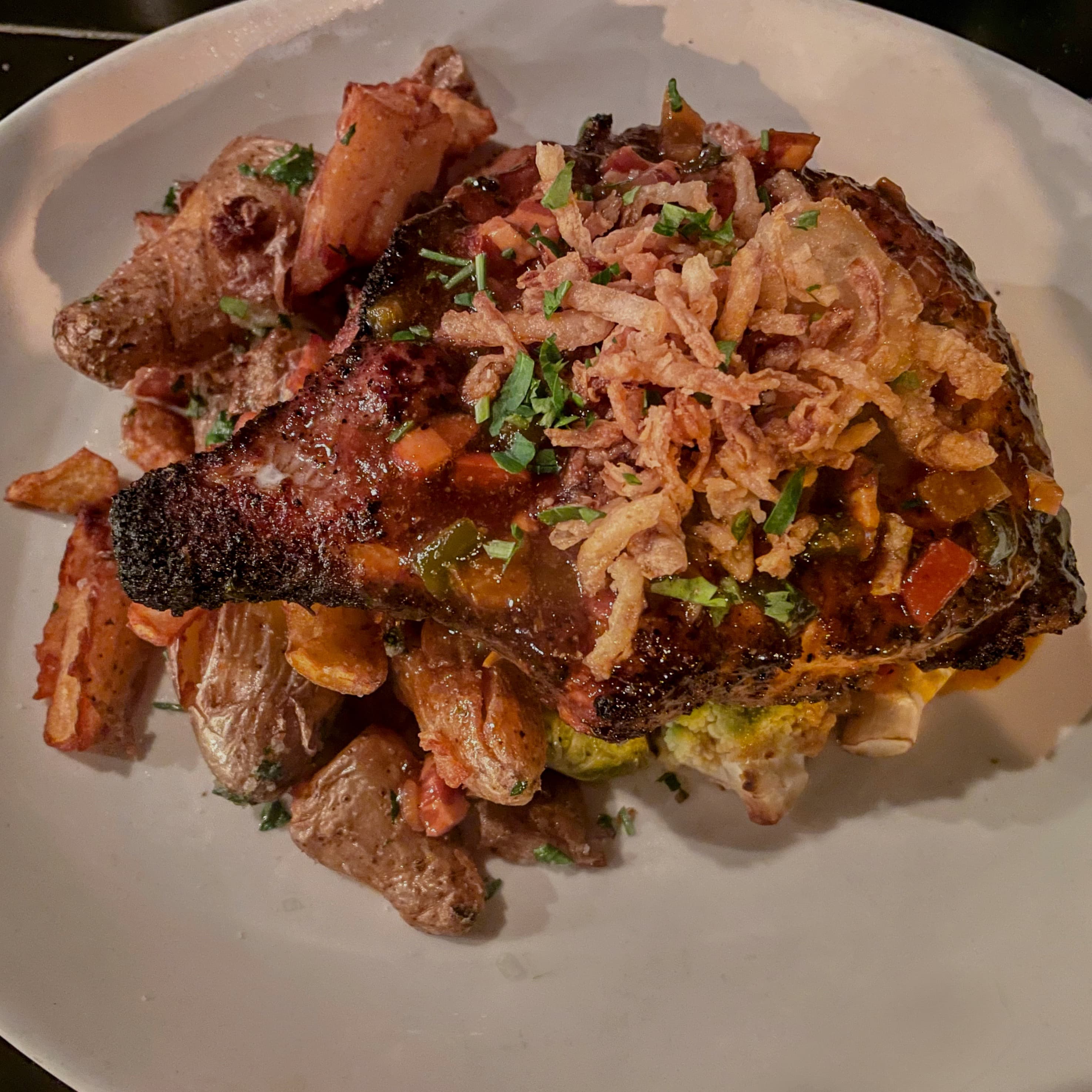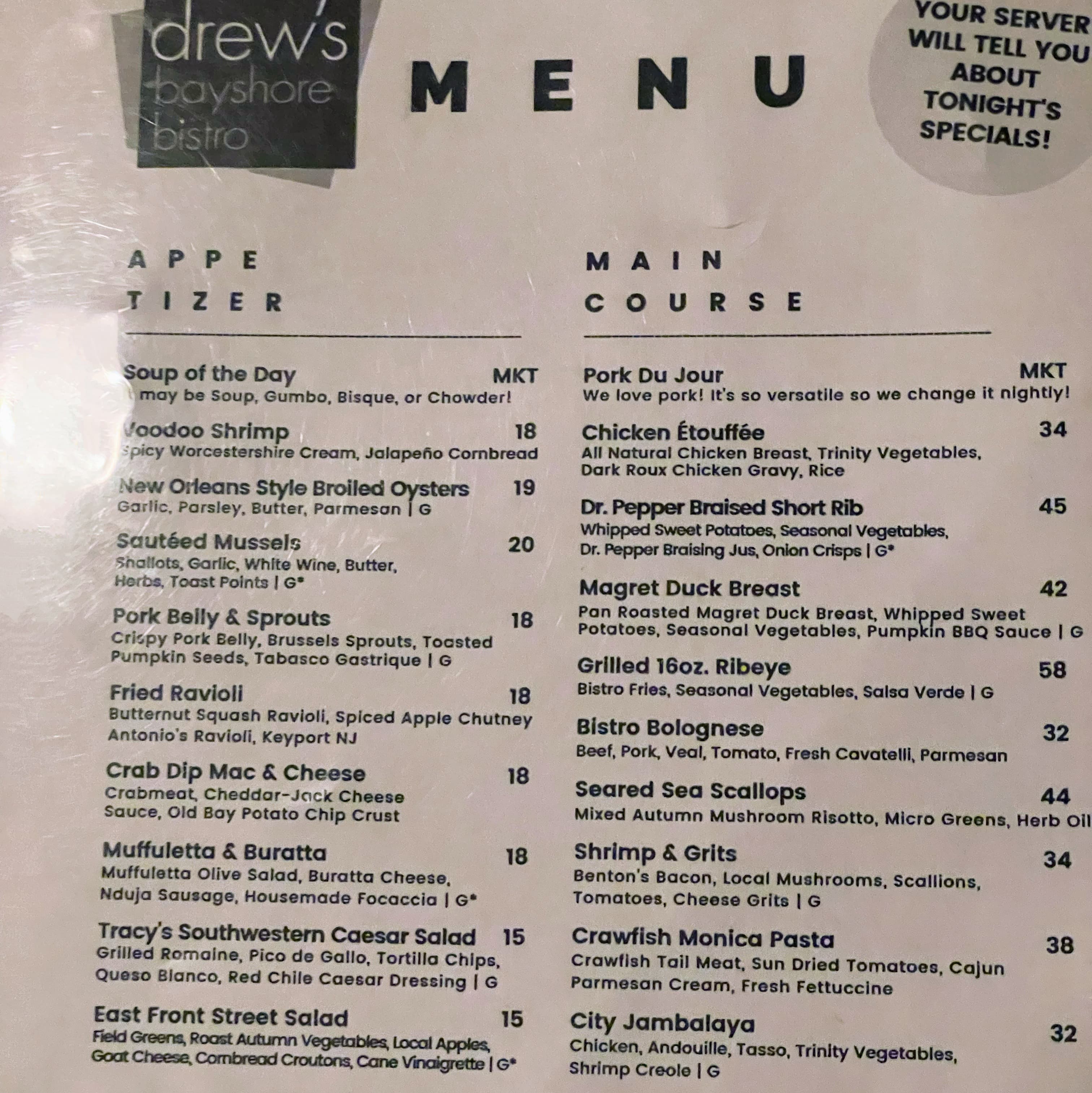 We enjoyed another outstanding dinner at Drew’s, in Keyport, NJ, including blackened pork chop; pork belly and sprouts in a spicy tabasco gastrique; broiled oysters; fried butternut squash ravioli with an apple chutney; spicy jambalaya pasta with crawfish, Andouille sausage, and chicken; spinach and gorgonzola salad; mussels. It all went great with an excellent cabernet and red blend. Menus attached for more detailed explanations.