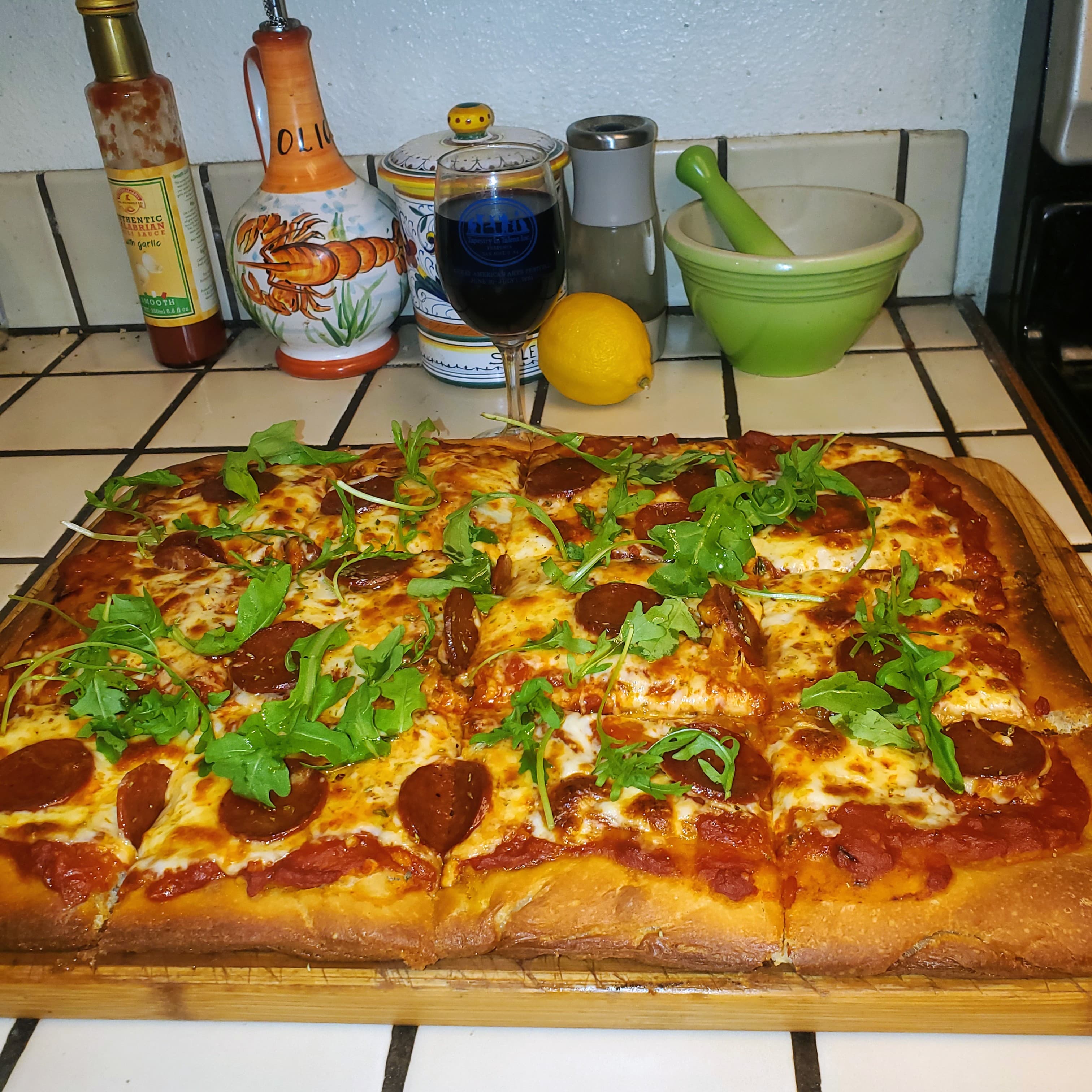 Pizza Saturday. My first attempt at a Sicilian style pizza. Tomato, mozzarella, pepperoni , topped with Arugula. Just a little bit overdone on the crust for me . Otherwise good. These pan pizzas are a workout. Long rising times . I will continue on having fun . Cheers.
