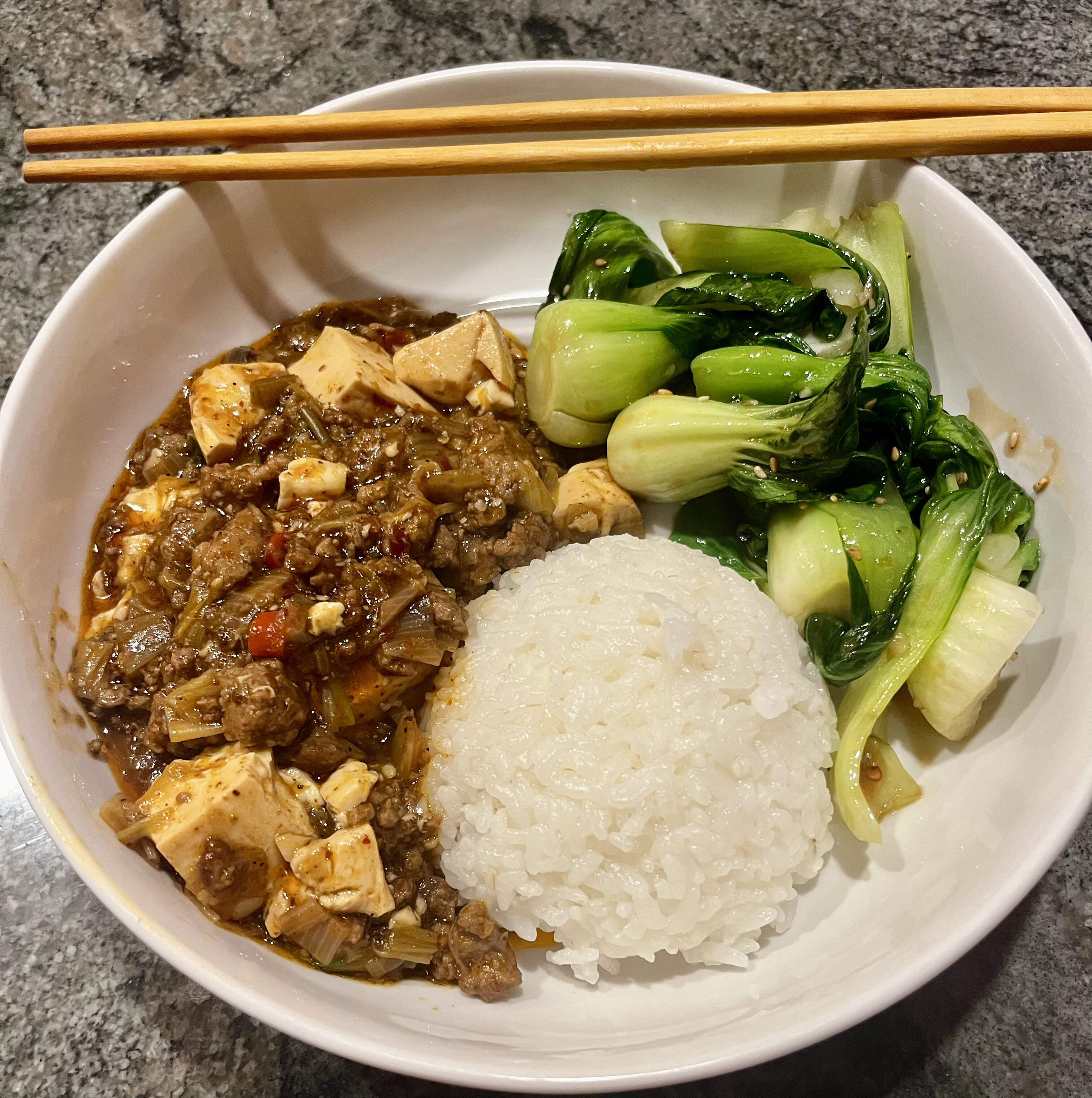 The bok choy was weirdly underdone, despite spending more time in the wok than usual, so we had to nuke it a bit. Still was on the kronchier side, but tasty.