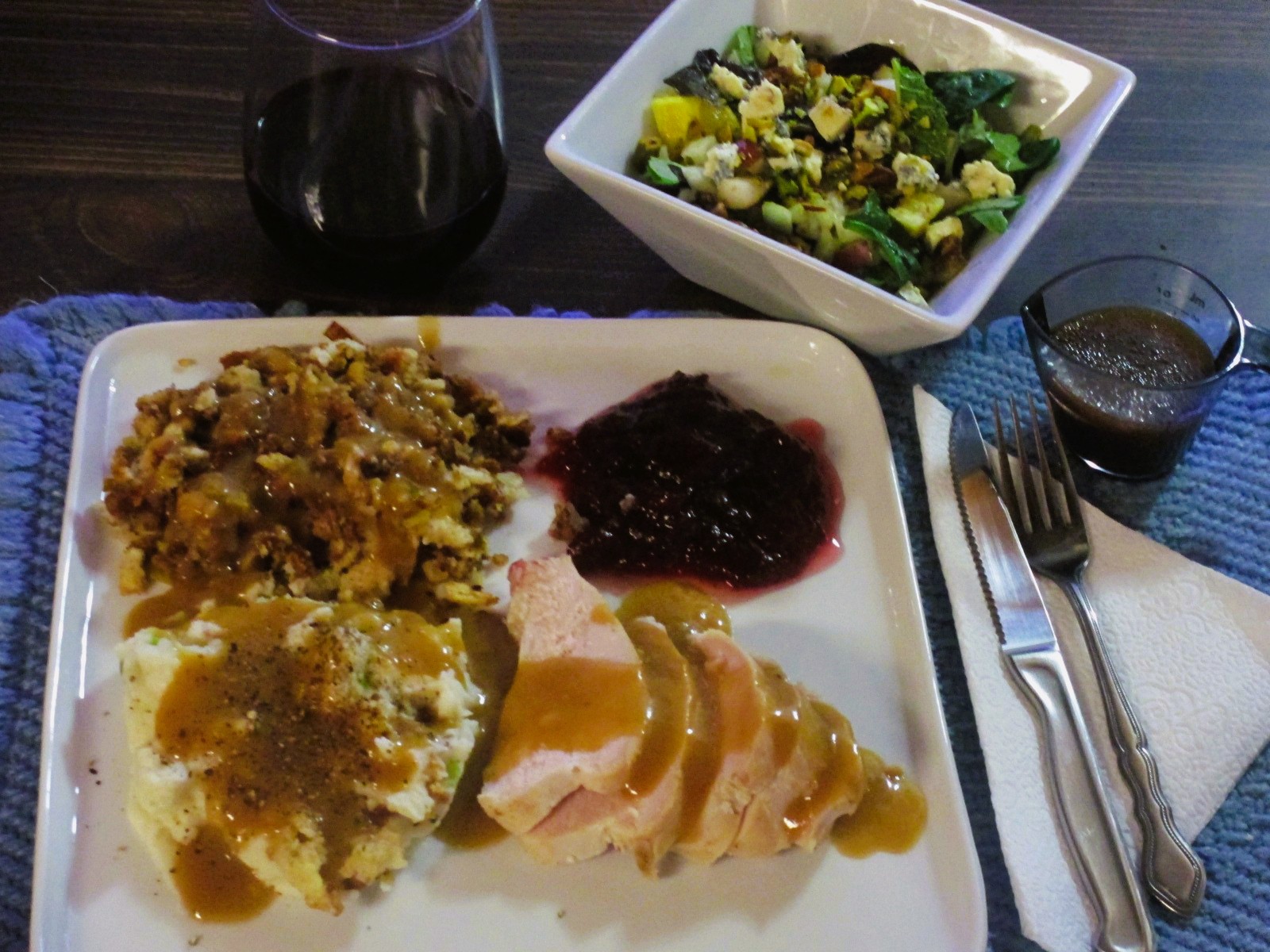 Thanksgiving 2.0. The only difference was the salad, I added orange, cambozola, pasticcios and dressing was maple balsamic. There was a Gibson rocks and wine with. The other half of the breast is in the freezer, probably will be Christmas dinner. What’s left of this half will be soup, maybe turkey salad if there is enough.