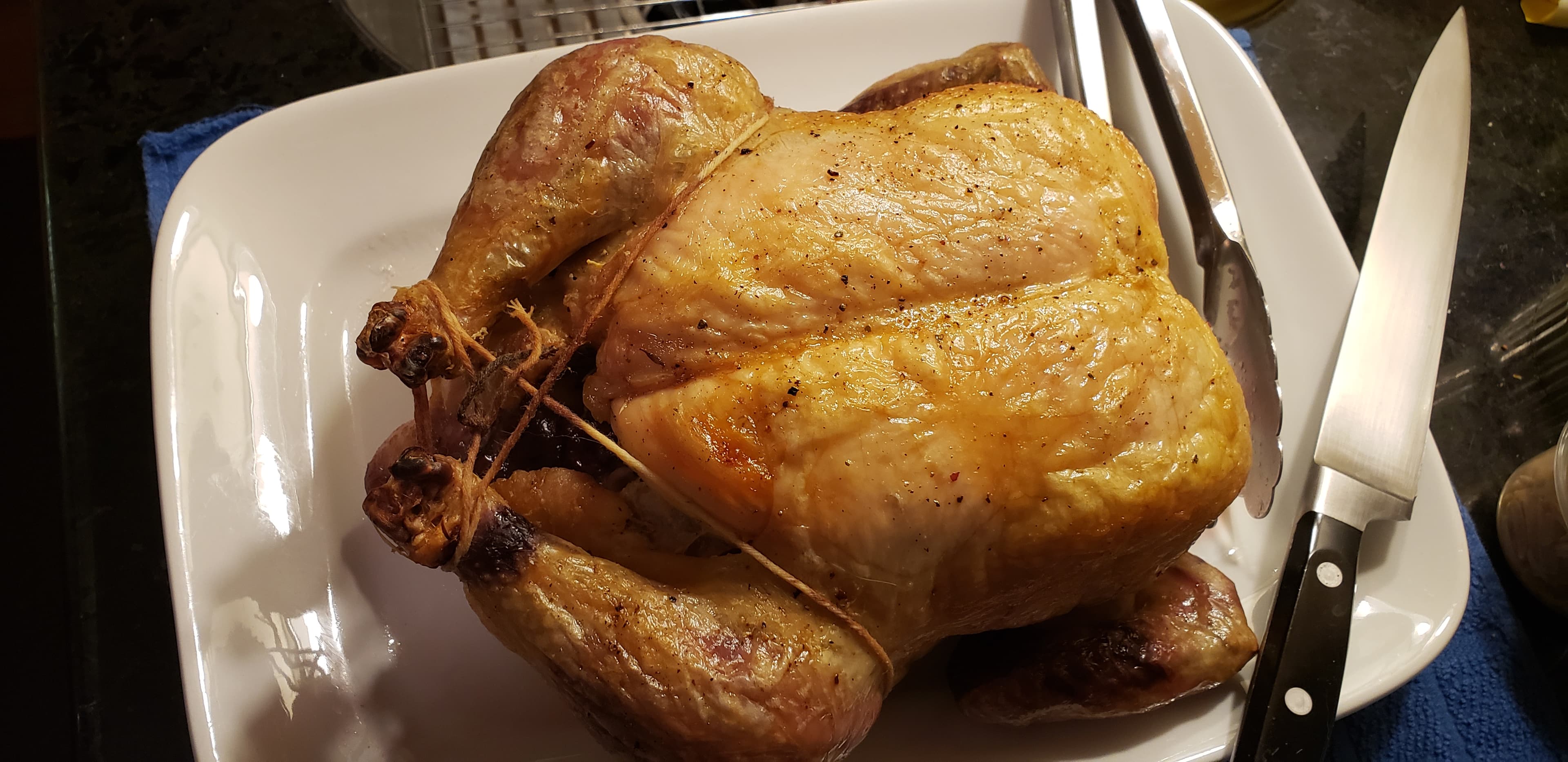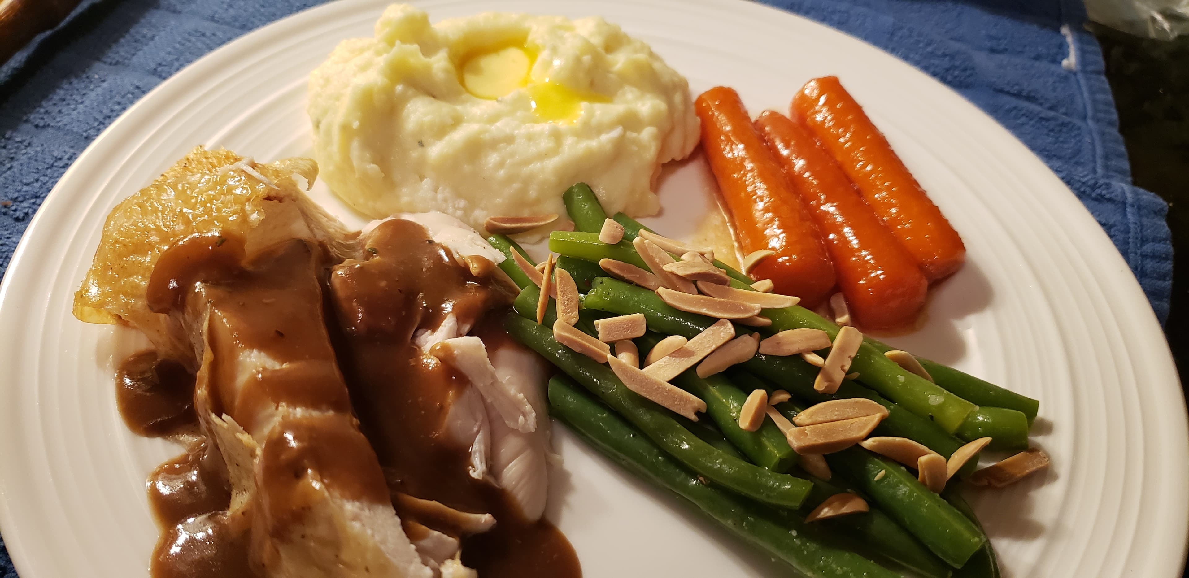 My sort-of Thanksgiving dinner for myself: a 6.75 lb. roasted whole chicken that had been dry-brined for 24+ hours with just s/p on the skin, then roasted at 425° for 1 hour, 40 minutes. The sides were sour-creamy mashed potatoes, glazed carrots, and steamed green beans with toasted almonds.