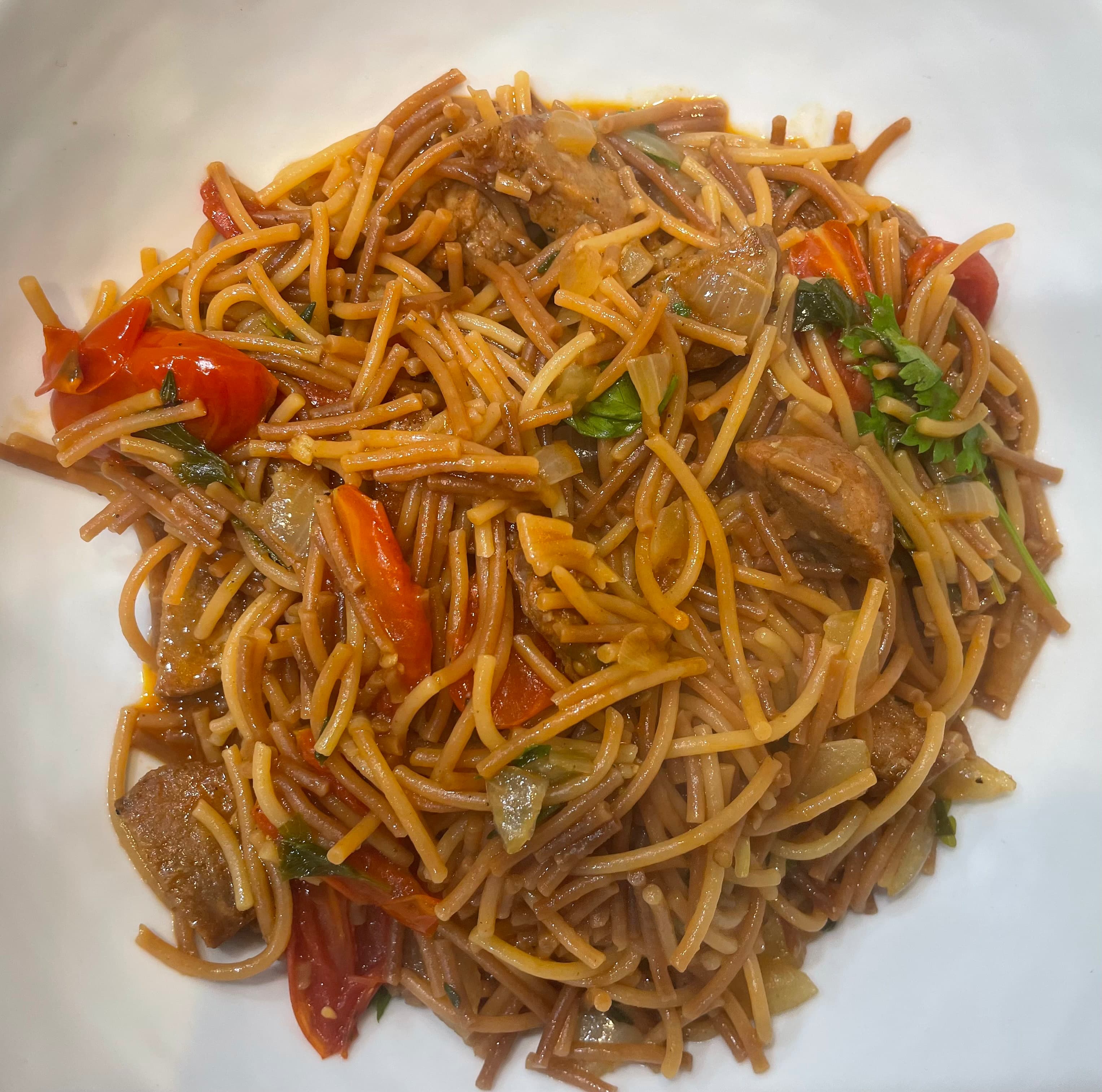 Variation on Fideua with Chorizo and Tomatoes - chorizo is pan-seared until slightly crispy and removed. Fideo pasta gets seared in the chorizo oil until browned and afterwards gets cooked with onions, garlic, cherry tomatoes, thyme, parsley and white wine in chicken broth. Finished with a little bit of sugar and lemon juice