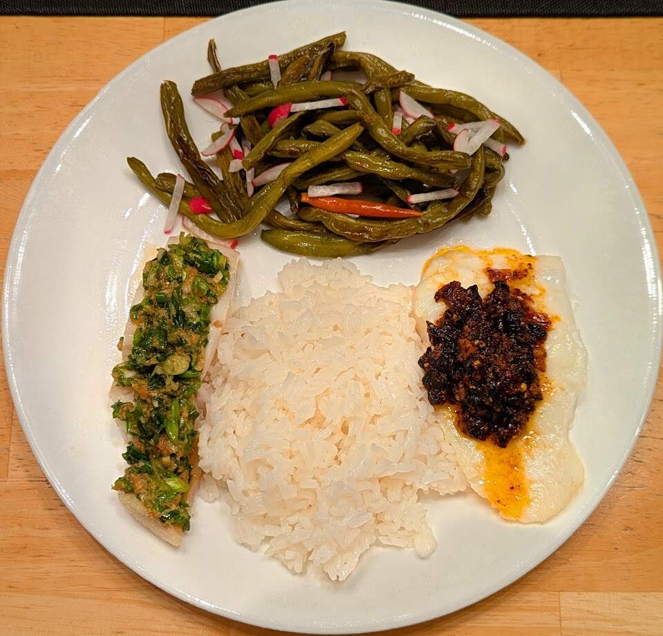 Roasted cod with two sauces - ginger scallion and chile with fermented black beans and garlic, homemade pickled green beans and radish salad, and jasmine rice. I made the beans on Sunday and used some on Monday for my noodles. They were pretty good then, but now that it’s had a chance to meld a few more days, they’re even better! A very satisfying meal and BF should be home from his business trip in a few hours, although I will likely be asleep!