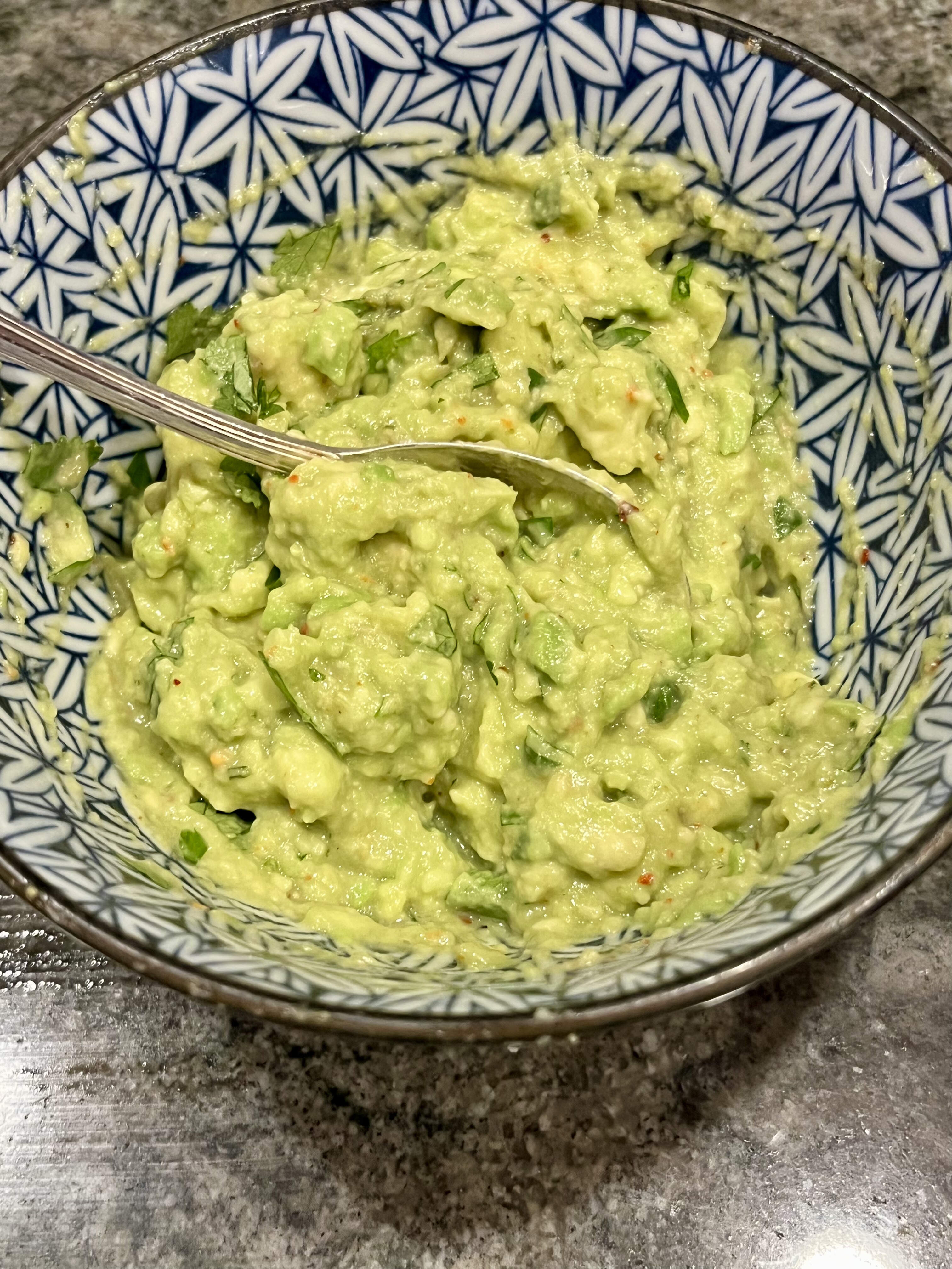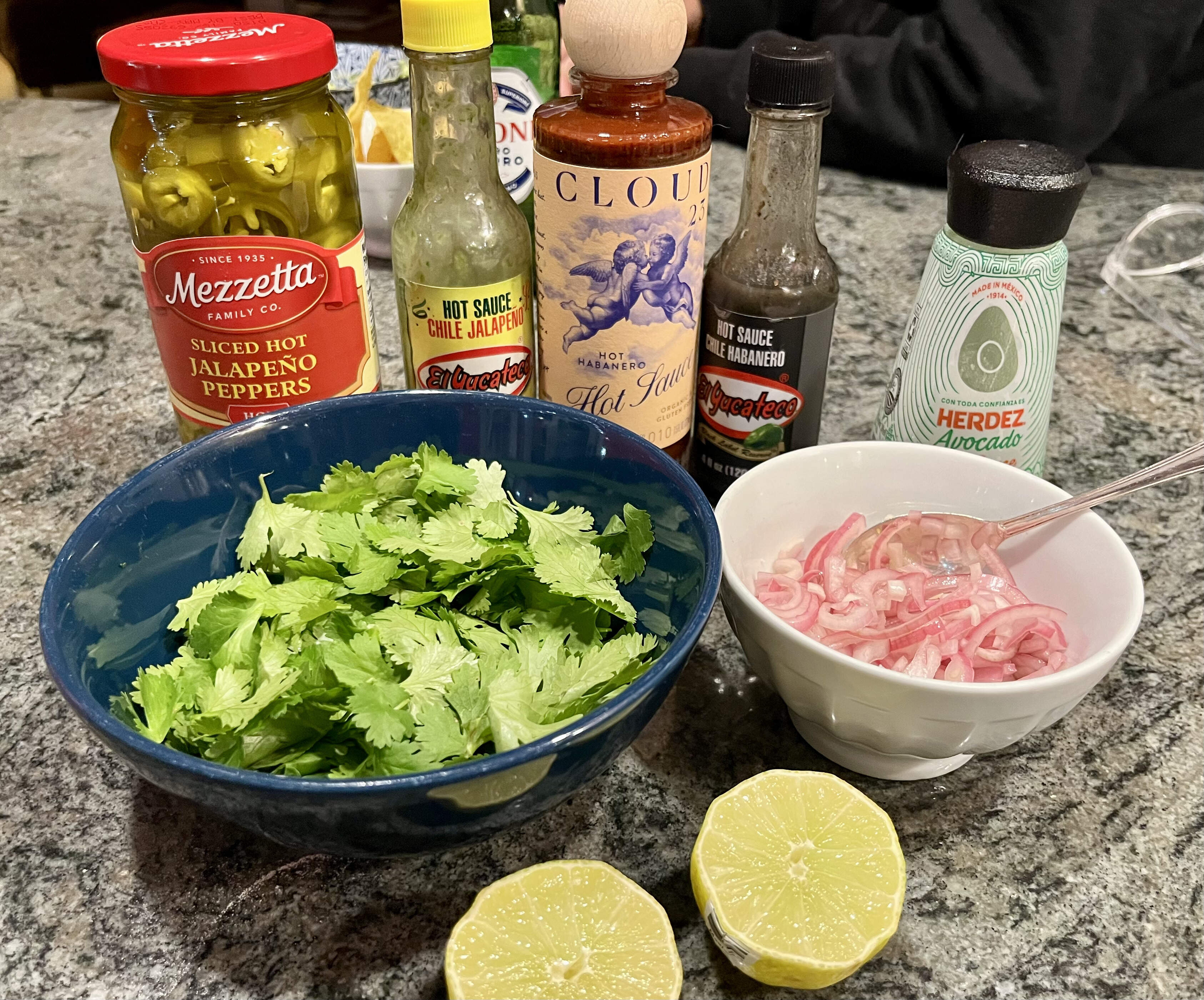 As for WFD, we’d debated Cubanos vs. quesadillas or tacos, what with TPSTO pork in the fridge, and I initially felt these temps deserved to be smothered in melty cheese. But after snacking on the guac I threw together (1.5 avocados, lotsa lime, Sinatra, hot sauce, cumin, tajin & salt) for our app