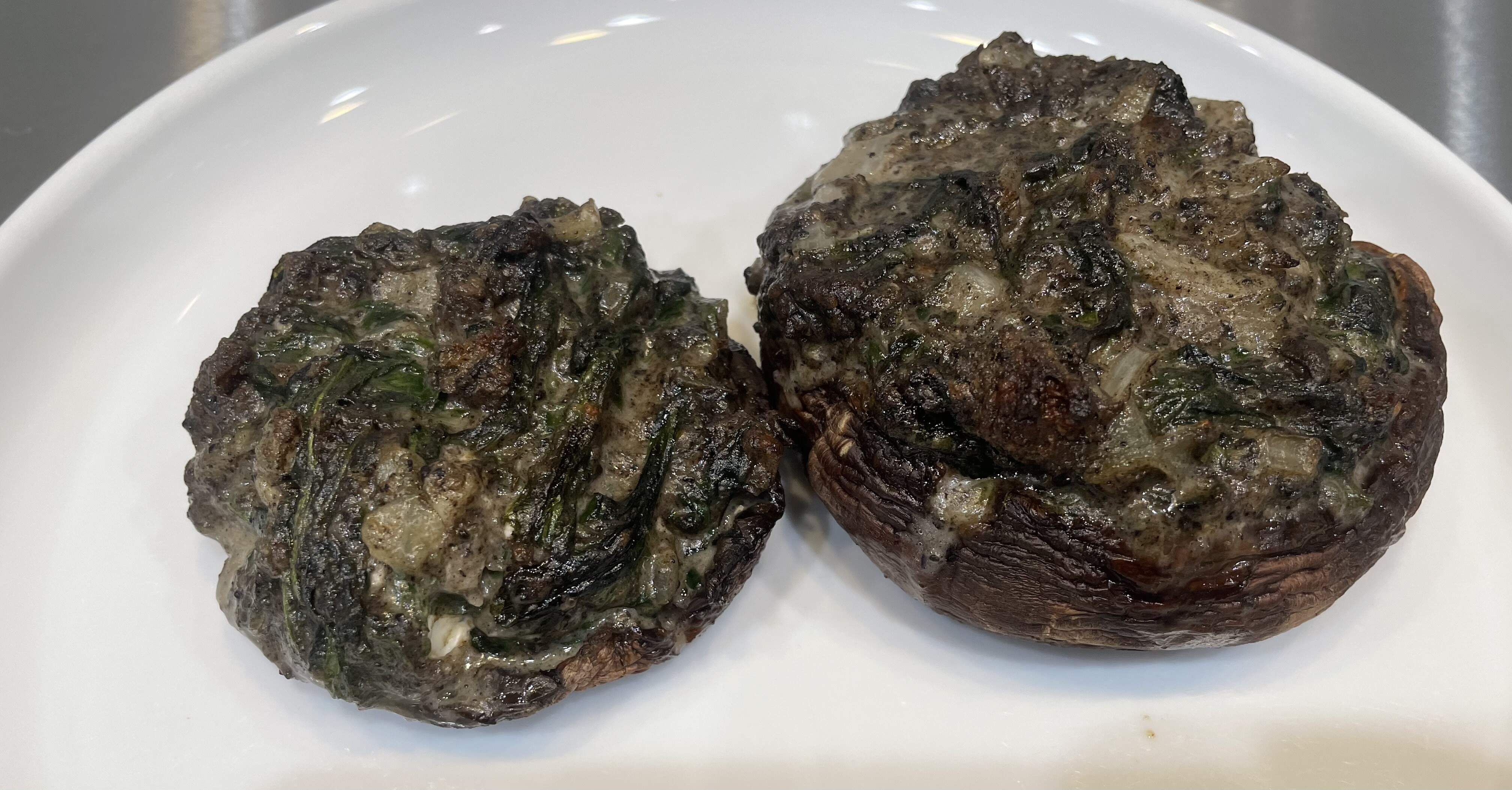 Portobellos with Truffle-Spinach Filling - not really photogenic but very tasty. Portobellos are quickly pre-seared under the broiler and then filled with a mix of spinach, truffle paste, truffle butter, onion, garlic, toasted breadcrumbs, cream cheese, parmesan and sage and baked in the oven