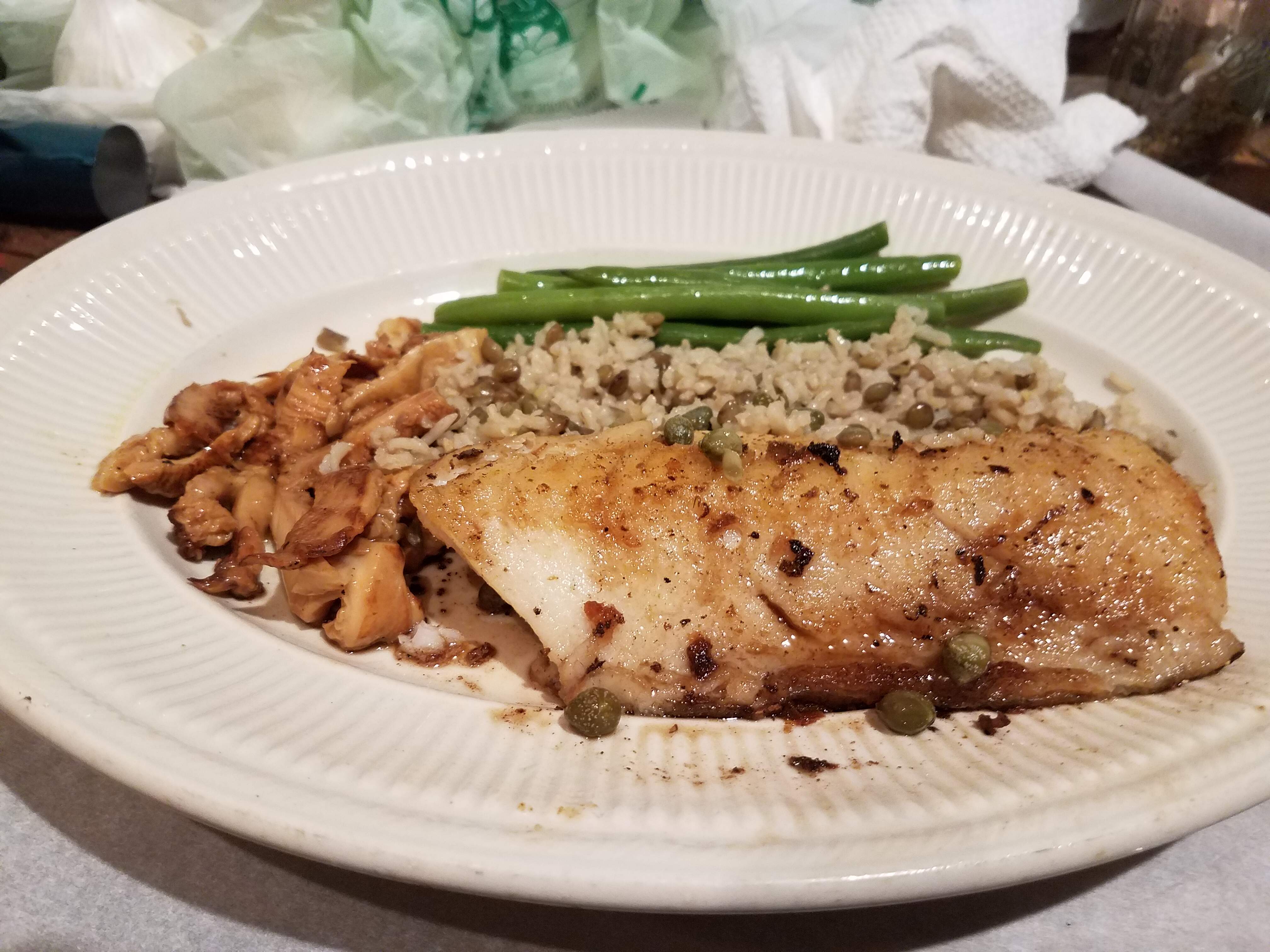 Picatta-ish black cod, with a brown rice and lentil pilaf, haricots and chanterelles. I forgot to add white wine.
