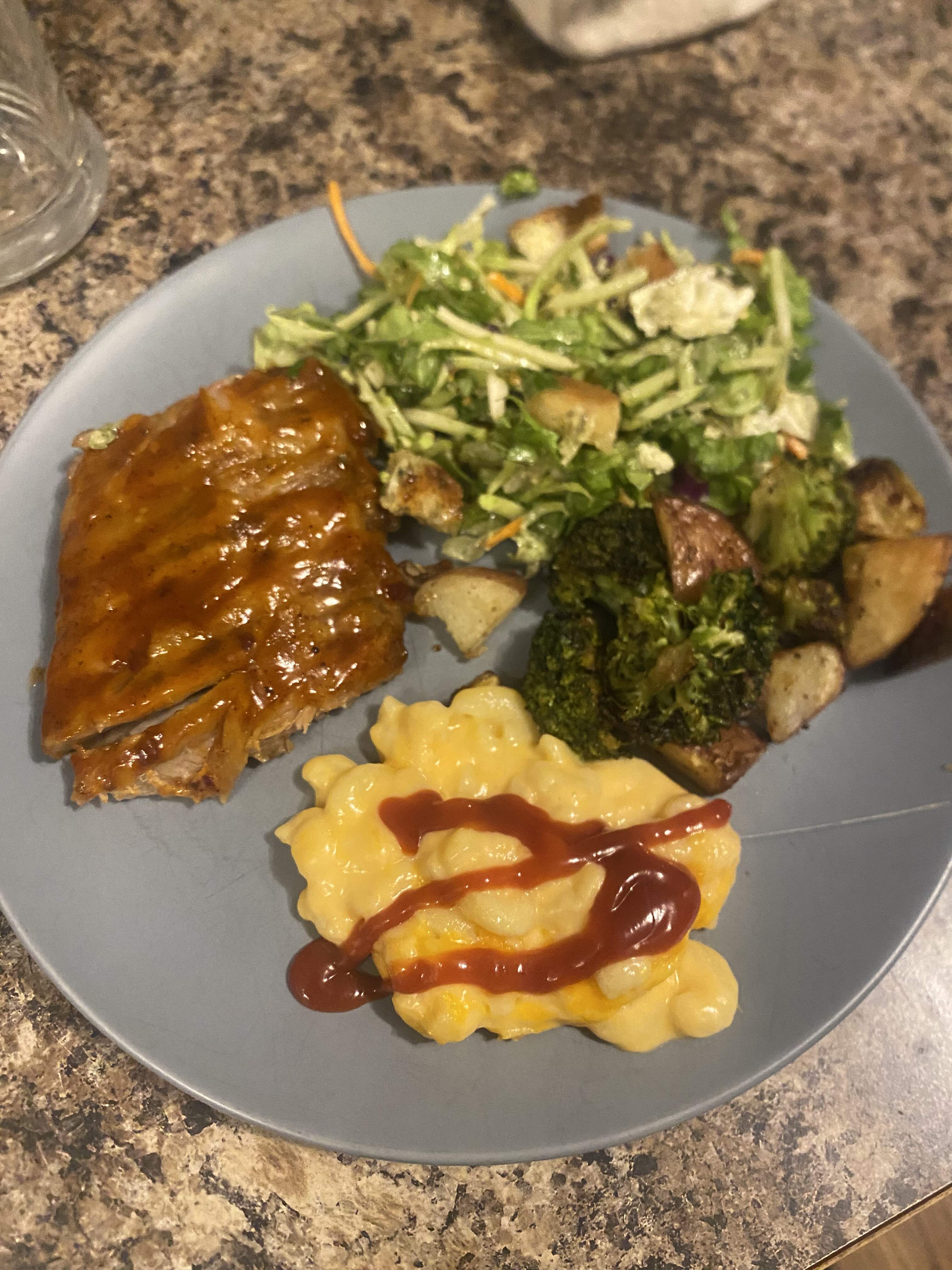 Ribs, mac and cheese (yes, that’s ketchup! I am Canadian after all), bagged salad and some leftover fondue veggies.