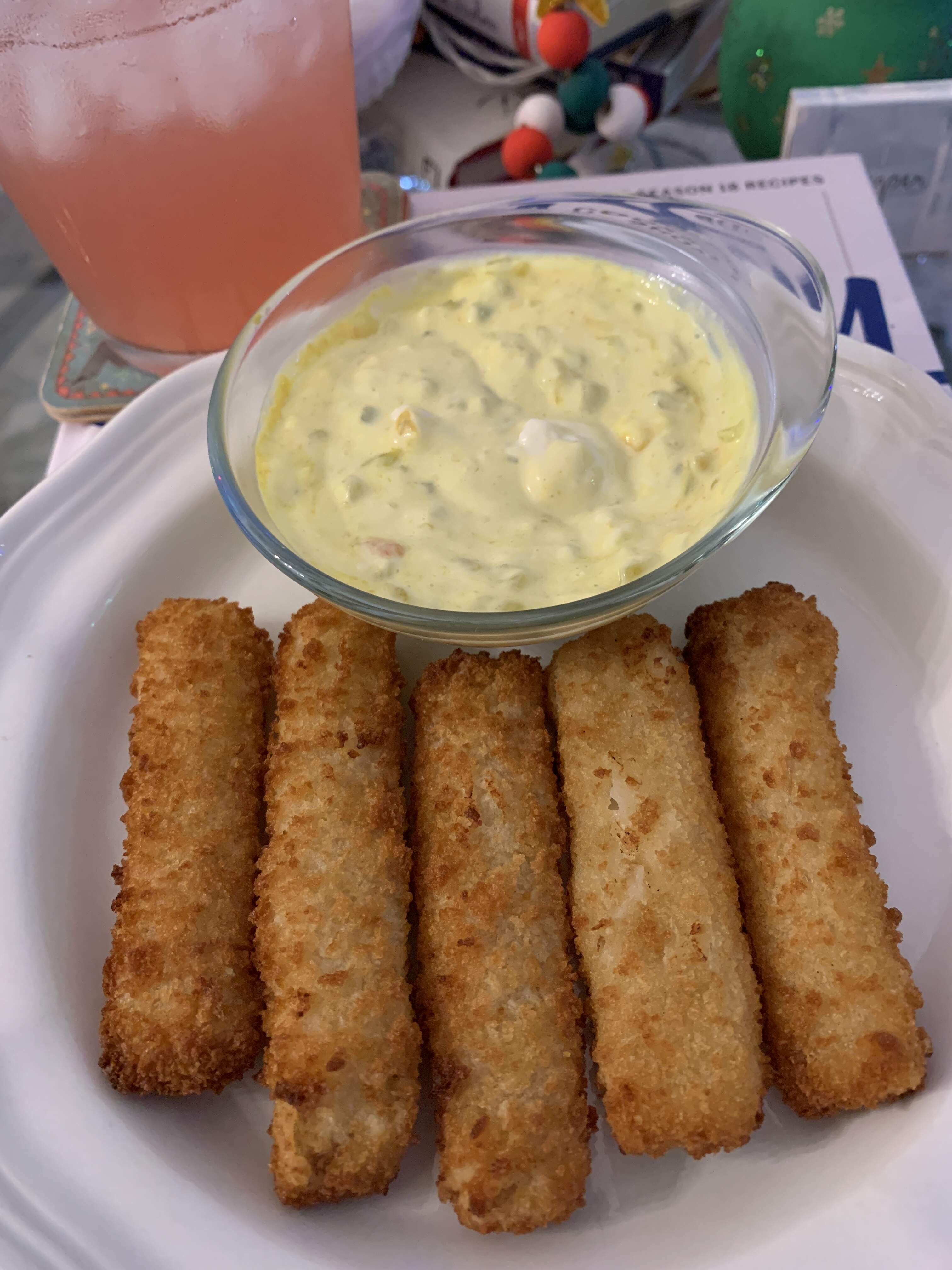 Ate a large pomegranate so wasn’t that hungry for dinner. Had tartar sauce with a side of fish sticks to scratch that craving for salt.