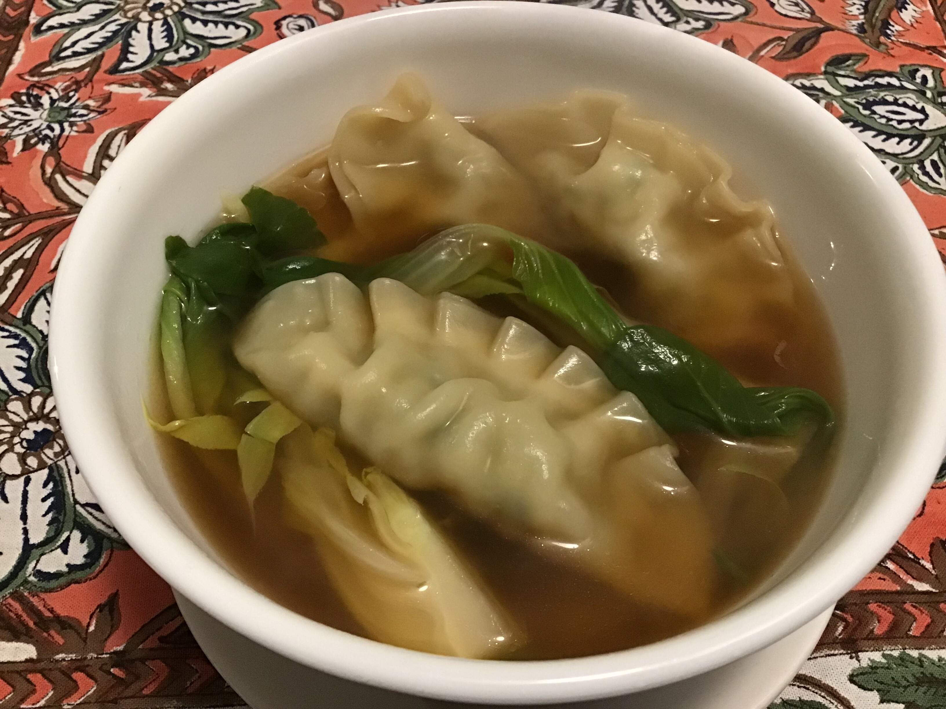No heavy lifting tonight: baby bok choy and frozen dumplings in doctored chicken broth. Hit the spot.