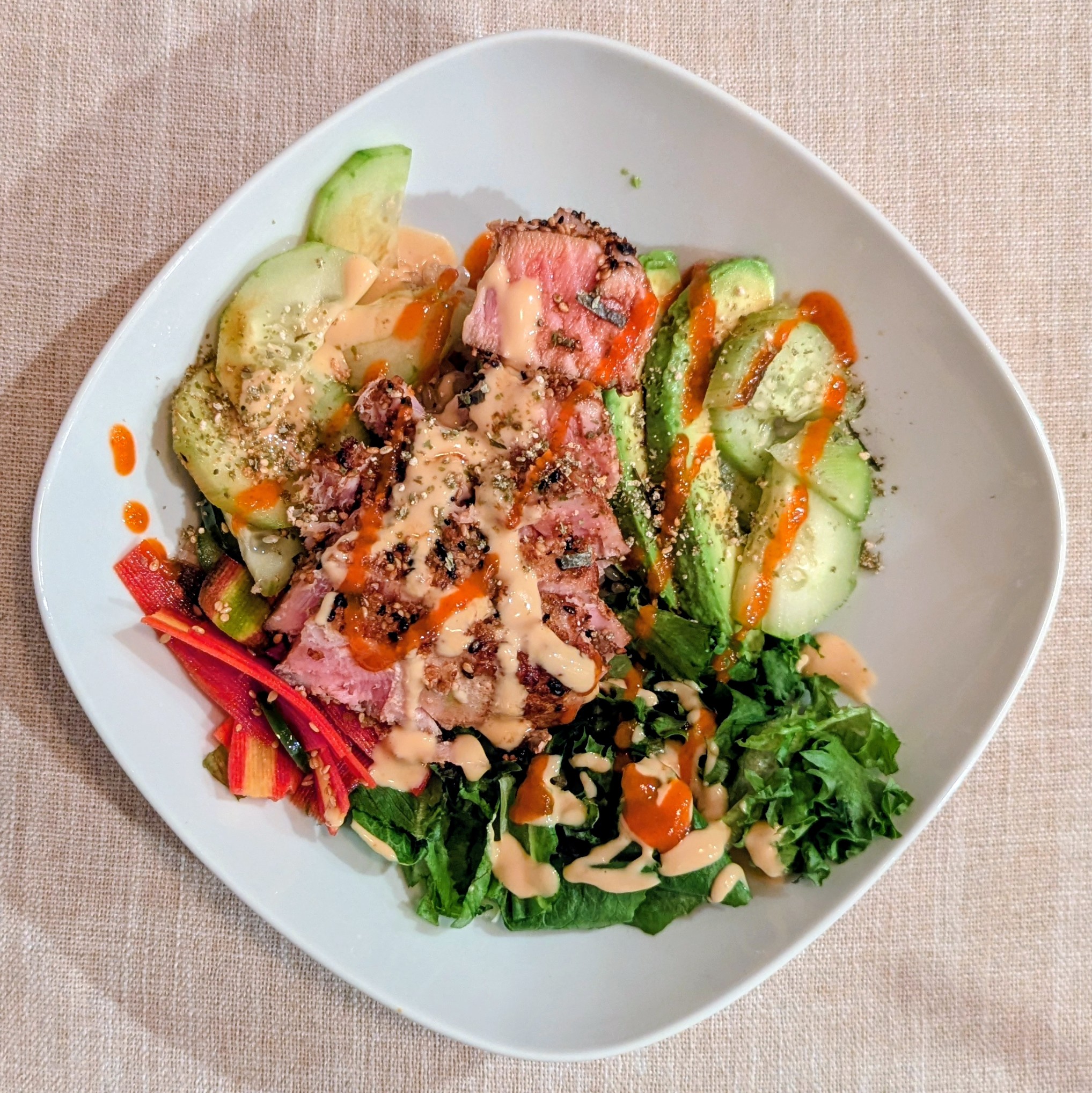 Tonight the kiddo and I made seared sesame tuna sushi bowls with seasoned brown rice, avocado, sesame carrot-jalapeno salad, mixed greens, cucumber, furikake, and creamy Sriracha dressing. I added kimchi to my bowl.