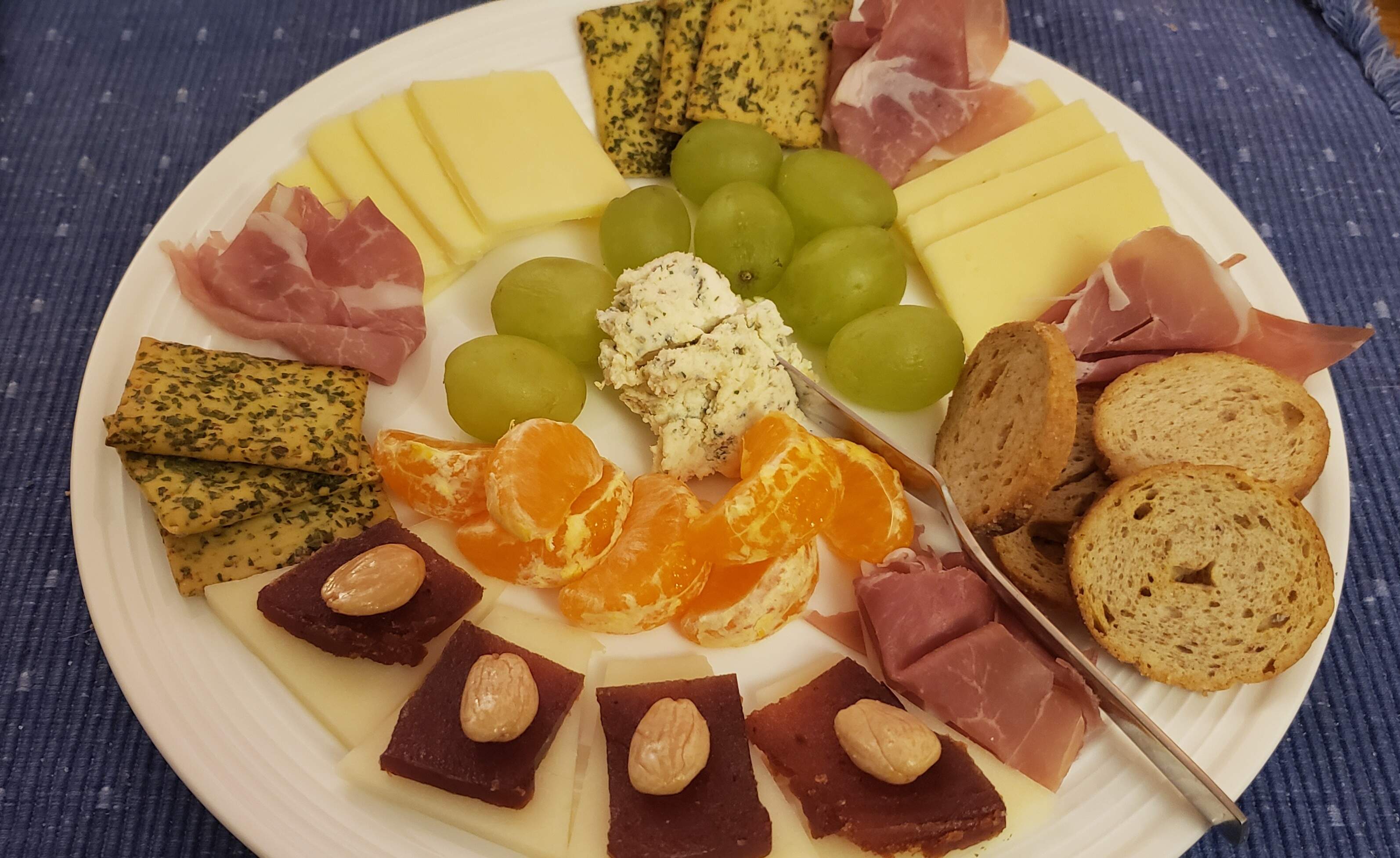 Wasn’t really hungry when I got home, but I knew I’d need some nibblies to tide me over. Ended up deciding on a charcuterie plate: Manchego cheese, membrillo, & Marcona almonds; proscuitto; Monterey Jack cheese, parsley crackers from Trader Joe’s; Cabot’s Seriously Sharp cheddar, sea salt Melba crackers, homemade garlic-herb cheese, green grapes, and a small Satsuma mandarin.
